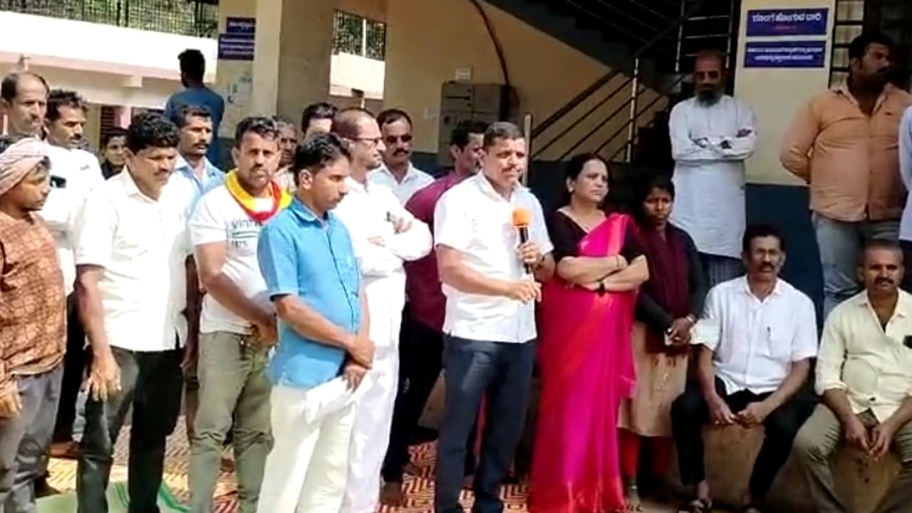 - - - -16ಟಿಟಿಎಚ್01:ಪ್ರತಿಭಟನೆಯಲ್ಲಿ ಹಣಗೆರೆ ಗ್ರಾಪಂ ಅಧ್ಯಕ್ಷ ರಾಘವೇಂದ್ರ ಮಾತನಾಡಿದರು.
