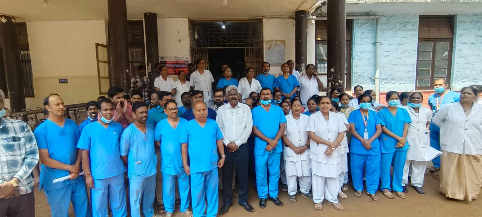 ರೋಗಿಯ ಸಂಬಂಧಿಗಳು ಸಾಫ್ಟ್ ನರ್ಸ್ರೊಬ್ಬರ ಮೇಲೆ ಮಾಡಿದ್ದಾರೆನ್ನಲಾದ ಹಲ್ಲೆಯನ್ನು ಖಂಡಿಸಿ ಇಲ್ಲಿನ ಜಿಲ್ಲಾಸ್ಪತ್ರೆಯ ಸ್ಪಾಫ್ ನರ್ಸ್ಗಳು ಬುಧವಾರ ಕೆಲಕಾಲ ಸೇವೆ ಸ್ಥಗಿತಗೊಳಿಸಿ ತುರ್ತು ನಿಗಾ ಘಟಕದ ಎದುರು ಪ್ರತಿಭಟನೆ ನಡೆಸಿದರು.ಮಂಗಳವಾರ ಸಂಜೆ ತನ್ನ ವಾರ್ಡ್ ಬಿಟ್ಟು ಬೇರೊಂದು ವಾರ್ಡ್ಗೆ ಬಂದಿದ್ದ ಮಾನಸಿಕ ಅಸ್ವಸ್ಥ ಮಹಿಳೆಯೊಬ್ಬರನ್ನು ಪ್ರಶ್ನಿಸಿದ್ದ ಸ್ಪಾಫ್ ನರ್ಸ್ ಬಸವರಾಜ ಕಬಾಡಗಿ, ಮಹಿಳೆಯ ಕೈ ಹಿಡಿದು ವಾರ್ಡ್ಗೆ ಹೋಗುವಂತೆ ಹೇಳಿದ್ದರಂತೆ. ಇದೇ ವಿಷಯಕ್ಕೆ ಆಕೆಯ ಸಂಬಂಧಿಗಳು ಆಸ್ಪತ್ರೆಗೆ ಬಂದು ಹಲ್ಲೆ ಮಾಡಿದ್ದಾರೆ. ಇದರಿಂದ ನಾವು ಭಯದಲ್ಲಿ ಕೆಲಸ ಮಾಡುವಂತಾಗಿದೆ ಎಂದು ಪ್ರತಿಭಟನಕಾರರು ಅಳಲು ತೋಡಿಕೊಂಡರು.