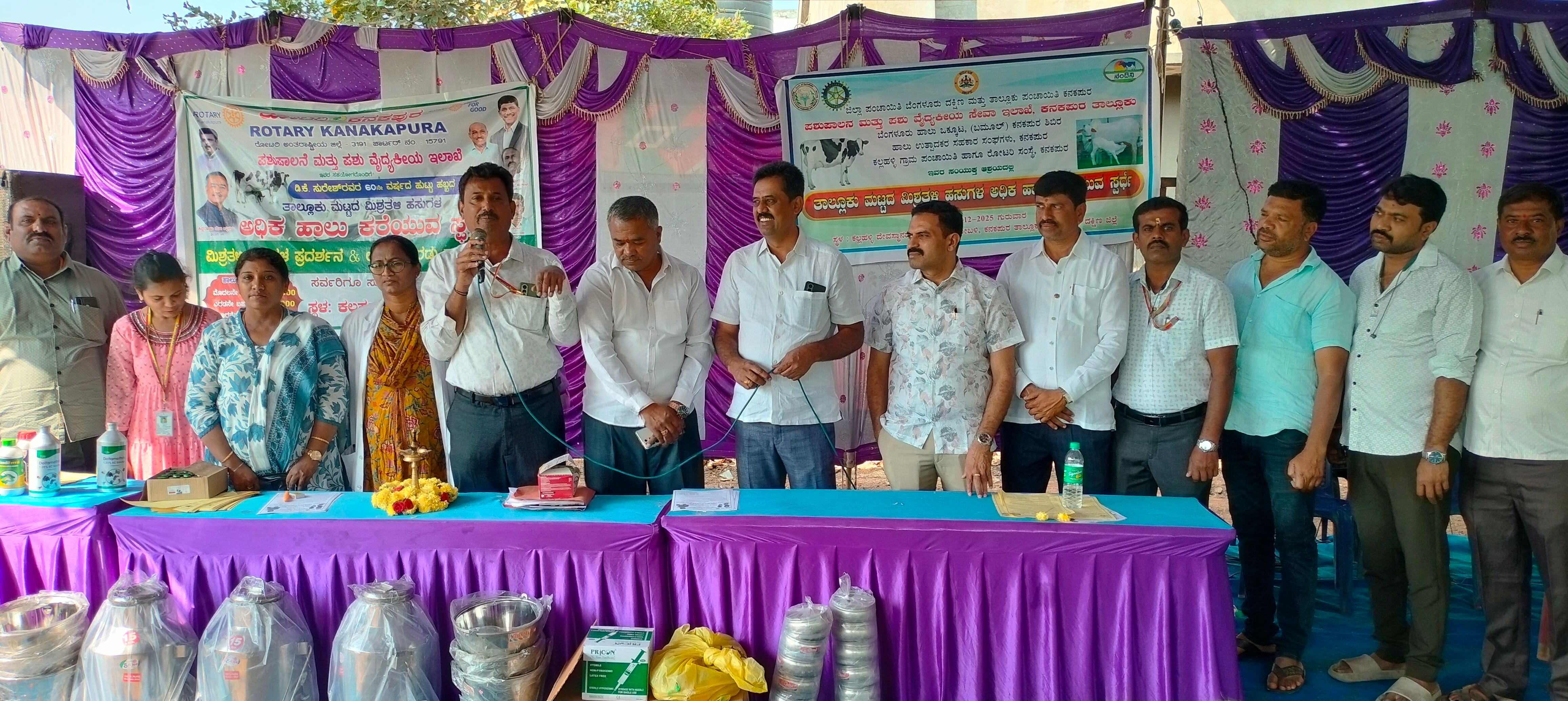 ಕಾರ್ಯಕ್ರಮದಲ್ಲಿ ಪಶು ಇಲಾಖೆ ಅಧಿಕಾರಿ ಡಾ.ಹರಿಣಿ, ಡಾ.ಪಂಕಜ, ಡಾ.ಸುಧೀರ್ ತೀರ್ಪುಗಾರರಾಗಿ ಕಾರ್ಯ ನಿರ್ವಹಿಸಿದರು. ತಾಪಂ ಮಾಜಿ ಅಧ್ಯಕ್ಷ ಎಂ.ಪುರುಷೋತ್ತಮ್, ಗ್ರಾಪಂ ಮಾಜಿ ಅಧ್ಯಕ್ಷರಾದ ನಟರಾಜ್, ಪ್ರಕಾಶ್ ಮತ್ತು ರೋಟರಿ ಸಂಸ್ಥೆಯ ಮುನಿರಾಜು, ಗವಿರಾಜು, ಮುನಿ ನಿಂಗಯ್ಯ ,ನಿಜಲಿಂಗಪ್ಪ, ಶ್ರೀಧರ್, ದೇಸಾಯಿ, ರೋಟರಿ ಪದಾಧಿಕಾರಿಗಳು, ಪಶುಪಾಲನಾ ಇಲಾಖೆ ನೌಕರರು ಉಪಸ್ಥಿತರಿದ್ದರು.ಕೆ ಕೆ ಪಿ ಸುದ್ದಿ 03:ಕಲ್ಲಹಳ್ಳಿಯ ಶ್ರೀ ವೆಂಕಟೇಶ್ವರ ಸ್ವಾಮಿ ದೇವಸ್ಥಾನದ ಮುಂಭಾಗದಲ್ಲಿ ರೋಟರಿ ಕನಕಪುರ ಮತ್ತು ಪಶುಪಾಲನಾ ಇಲಾಖೆ ಸಹಯೋಗದಲ್ಲಿ ಬಮೂಲ್ ಅಧ್ಯಕ್ಷ ಡಿ.ಕೆ.ಸುರೇಶ್ ಹುಟ್ಟುಹಬ್ಬದ ಪ್ರಯುಕ್ತ ಹಾಲು ಕರೆಯುವ ಸ್ಪರ್ಧೆ, ಮಿಶ್ರತಳಿ ಕರುಗಳ ಪ್ರದರ್ಶನ ಹಾಗೂ ಪಶು ಆರೋಗ್ಯ ತಪಾಸಣಾ ಶಿಬಿರ ನಡೆಯಿತು.