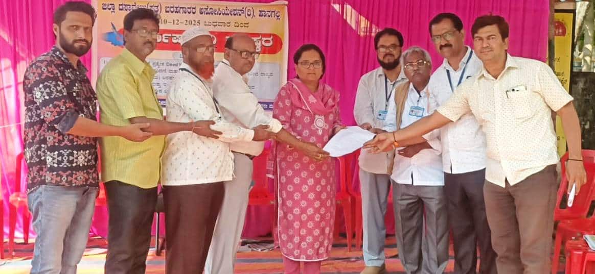 ಫೇಸ್ಲೆಸ್ ಹಾಗೂ ಪೇಪರ್ಲೆಸ್ ಆಗಿ ಆಸ್ತಿ ನೋಂದಣಿ ನಿಯಮ ವಿರೋಧಿಸಿ ದಸ್ತುಪತ್ರ ಬರಹಗಾರರು ಹಾನಗಲ್ಲ ತಾಲೂಕು ಕಚೇರಿಯ ಬಳಿ ಬುಧವಾರ ಪ್ರತಿಭಟನೆ ನಡೆಸಿ, ತಹಸೀಲ್ದಾರ್ಗೆ ಮನವಿ ಸಲ್ಲಿಸಿದರು.