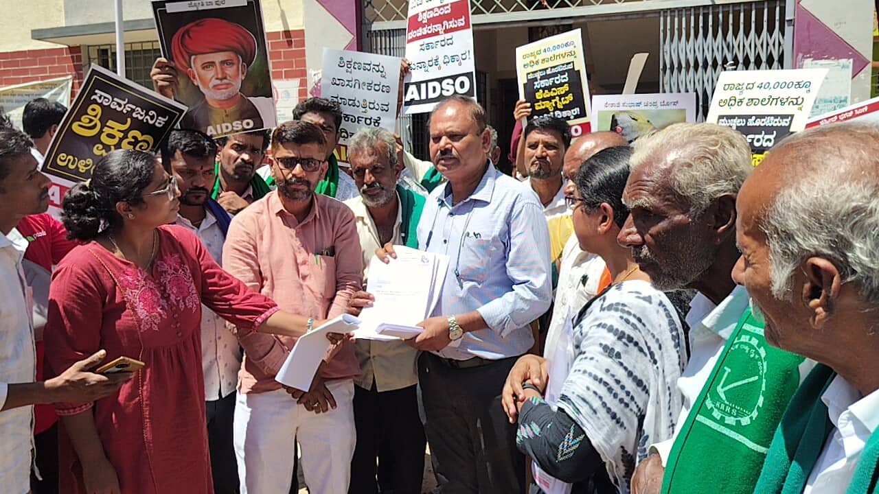 ಚನ್ನಪಟ್ಟಣ: ಹೊಂಗನೂರಿನ ಕೆಪಿಎಸ್ ಶಾಲೆ ಹೆಸರಿನಲ್ಲಿ ಅಕ್ಕಪಕ್ಕದ ಗ್ರಾಮಗಳ ಸರ್ಕಾರಿ ಶಾಲೆಗಳನ್ನು ಮುಚ್ಚದಂತೆ ಆಗ್ರಹಿಸಿ ಎಐಡಿಎಸ್ಒ ಹಾಗೂ ಎಸ್ಡಿಎಂಸಿಯಿಂದ ನಗರದ ಕ್ಷೇತ್ರ ಶಿಕ್ಷಾಣಾಧಿಕಾರಿ ಕಚೇರಿ ಎದುರು ಪ್ರತಿಭಟನೆ ನಡೆಸಲಾಯಿತು