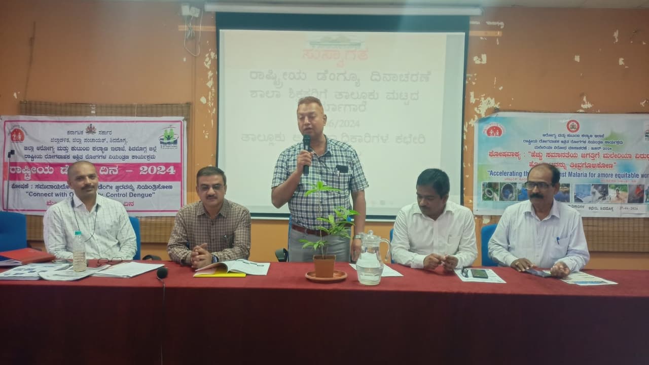 ಶಿವಮೊಗ್ಗದ ಜಿಲ್ಲಾ ಆರೋಗ್ಯ ಮತ್ತು ಕುಟುಂಬ ಕಲ್ಯಾಣಾಧಿಕಾರಿ ಕಚೇರಿ ಸಭಾಂಗಣದಲ್ಲಿ ಗುರುವಾರ ಪ್ರೌಢಶಾಲಾ ಶಿಕ್ಷಕರಿಗೆ ಆಯೋಜಿಸಿದ್ದ ಡೆಂಘೀ ಕುರಿತಾದ ತರಬೇತಿ ಕಾರ್ಯಾಗಾರ ನಡೆಯಿತು.