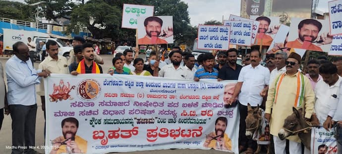 4ಕೆಆರ್ ಎಂಎನ್ 1.ಜೆಪಿಜಿರಾಮನಗರದ ಐಜೂರು ವೃತ್ತದಲ್ಲಿ ಸವಿತಾ ಸಮಾಜದ ಬಾಂಧವರು ವಿಧಾನ ಪರಿಷತ್ ಸದಸ್ಯ ಸಿ.ಟಿ.ರವಿ ವಿರುದ್ಧ ಕತ್ತೆಗಳ ಮೆರವಣಿಗೆ ನಡೆಸಿ ಪ್ರತಿಭಟಿಸಿದರು.