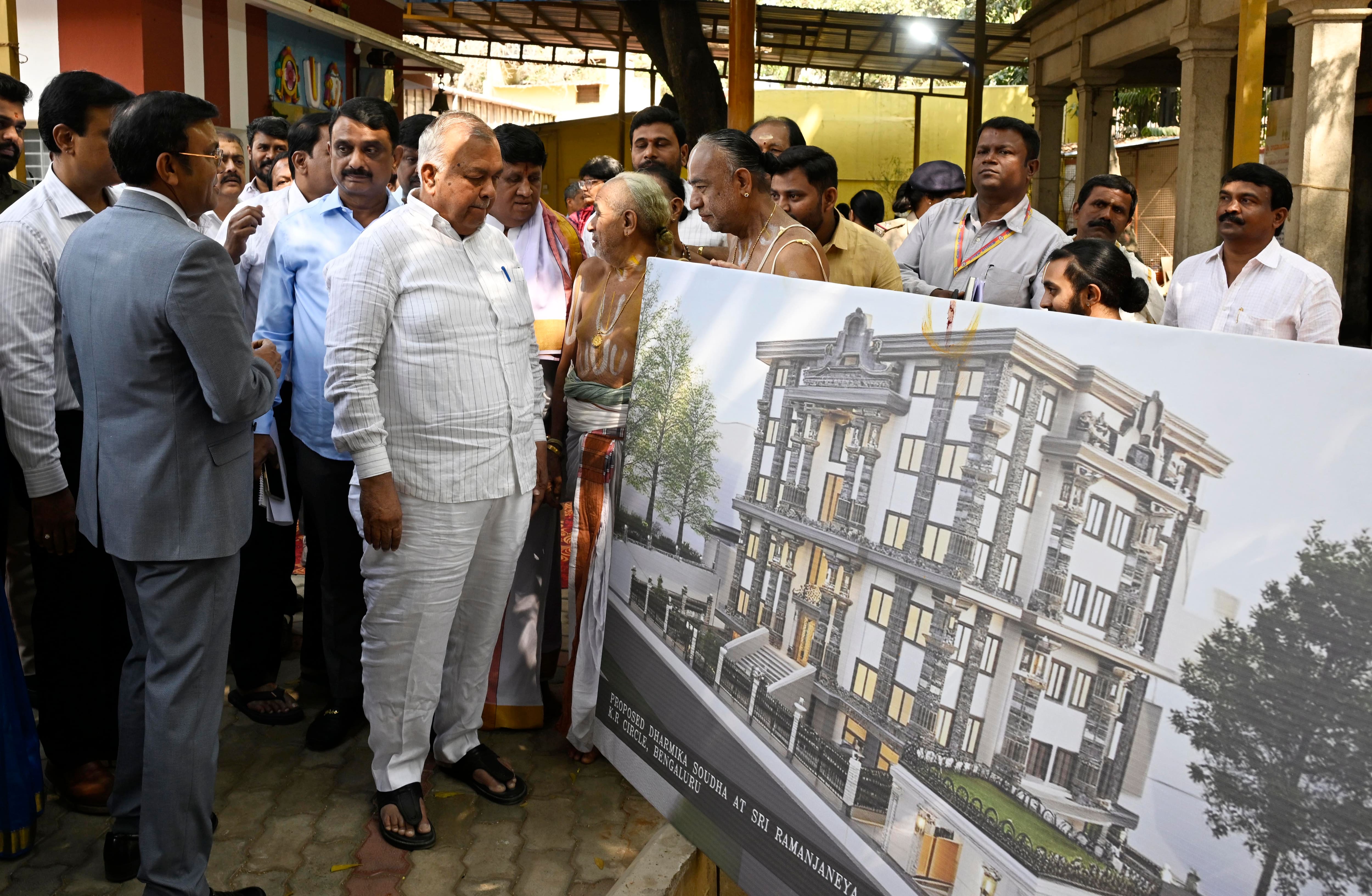 ಅದರಂತೆ ಎಂ.ಎಸ್. ಬಿಲ್ಡಿಂಗ್ ಆವರಣದಲ್ಲಿ ಮುಜರಾಯಿ ಇಲಾಖೆಗೆ ಸೇರಿದ ರಾಮಾಂಜನೇಯ ಸ್ವಾಮಿ ದೇವಸ್ಥಾನದ 919 ಚದರ ಮೀ. ಜಮೀನಿನಲ್ಲಿ 27.70 ಕೋಟಿ ರು. ವೆಚ್ಚದಲ್ಲಿ ಧಾರ್ಮಿಕ ಸೌಧ ನಿರ್ಮಾಣಕ್ಕೆ ಚಾಲನೆ ನೀಡಲಾಗಿದೆ. ಈ ಧಾರ್ಮಿಕ ಸೌಧವು ಹೊಯ್ಸಳ ಶೈಲಿ ವಾಸ್ತುಶಿಲ್ಪದಲ್ಲಿ ನಿರ್ಮಾಣವಾಗುತ್ತಿರುವುದು ವಿಶೇಷವಾಗಿದೆ.ಒಟ್ಟು ನಾಲ್ಕು ಅಂತಸ್ತಿನ ಧಾರ್ಮಿಕ ಸೌಧ ಕಟ್ಟಡ ನಿರ್ಮಾಣ ಮಾಡಲಾಗುತ್ತದೆ. ನೆಲಮಹಡಿಯಲ್ಲಿ ವಾಹನ ನಿಲುಗಡೆ ವ್ಯವಸ್ಥೆ, ಡಿಜಿಟಲ್ ಗ್ರಂಥಾಲಯ, ಆರ್ಡಿಪಿಆರ್, ರೆಕಾರ್ಡ್ಸ್ ಕೊಠಡಿ ಇರಲಿದೆ. ಮೊದಲನೇ ಮಹಡಿಯಲ್ಲಿ ಕೋರ್ಟ್ ಹಾಲ್, ಆಯುಕ್ತರ ಕಚೇರಿ, ಸರ್ವೇ ವಿಭಾಗದ ಕಚೇರಿಗಳಿರಲಿವೆ. ಎರಡನೇ ಮಹಡಿಯಲ್ಲಿ ಆಗಮ ವಿಭಾಗದ ಅಧಿಕಾರಿಗಳು, ಐಟಿ ವಿಭಾಗ, ಎಂಜಿನಿಯರಿಂಗ್ ವಿಭಾಗದ ಕಚೇರಿ, ಮೀಟಿಂಗ್ ಹಾಲ್ಗಳಿರಲಿವೆ. ಮೂರನೇ ಮಹಡಿಯಲ್ಲಿ ಓಪನ್ ಆಫೀಸ್ ಹಾಲ್, ಸೂಪರಿಟೆಂಡೆಂಟ್ ಕಚೇರಿ ಇರಲಿದ್ದು, ನಾಲ್ಕನೇ ಮಹಡಿಯಲ್ಲಿ ಸಭಾಂಗಣವನ್ನು ನಿರ್ಮಿಸಲಾಗುತ್ತದೆ.