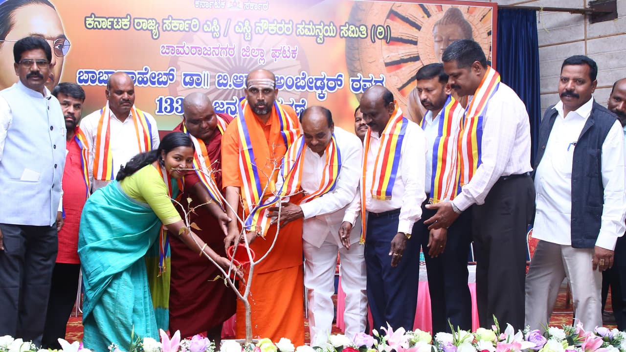 25ಸಿಎಚ್ಎನ್13ಚಾಮರಾಜನಗರದ ಜಿಲ್ಲಾಡಳಿತ ಭವನದ ಜೆ.ಎಚ್. ಪಟೇಲ್ ಸಭಾಂಗಣದಲ್ಲಿ ಕರ್ನಾಟಕ ರಾಜ್ಯ ಸರ್ಕಾರಿ ಎಸ್ಸಿ, ಎಸ್ಟಿ ನೌಕರರ ಸಮನ್ವಯ ಸಮಿತಿ. ಚಾಮರಾಜನಗರ ಜಿಲ್ಲಾ ಘಟಕ ವತಿಯಿಂದ ನಡೆದ ಬಾಬಾ ಸಾಹೇಬ್ ಡಾ. ಬಿ.ಅರ್.ಅಂಬೇಡ್ಕರ್ ರವರ ೧೩೩ ನೇ ಜನ್ಮದಿನಾಚರಣೆ. ಕಾರ್ಯಕ್ರಮದಲ್ಲಿ ಬೋಧಿವೃಕ್ಷಕ್ಕೆ ನೀರಾಕುವ ಮೂಲಕ ಜ್ಞಾನಪ್ರಕಾಶ ಸ್ವಾಮೀಜಿ ಉದ್ಘಾಟಿಸಿದರು.