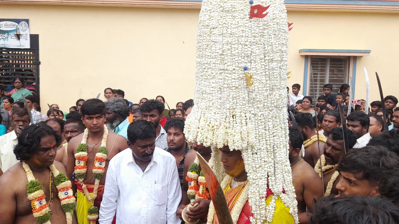 ಹೊಸಕೋಟೆ ತಾಲೂಕಿನ ಮುಗಬಾಳದಲ್ಲಿ ಶ್ರೀ ಧರ್ಮರಾಯಸ್ವಾಮಿ ದ್ರೌಪದಮ್ಮನವರ ಕರಗ ಮಹೋತ್ಸವದ ಪ್ರಯುಕ್ತ ವೀರಗಾರರು ಕರಗದ ಜೊತೆ ಮೆರವಣಿಗೆಯಲ್ಲಿ ತೆರಳಿದರು.