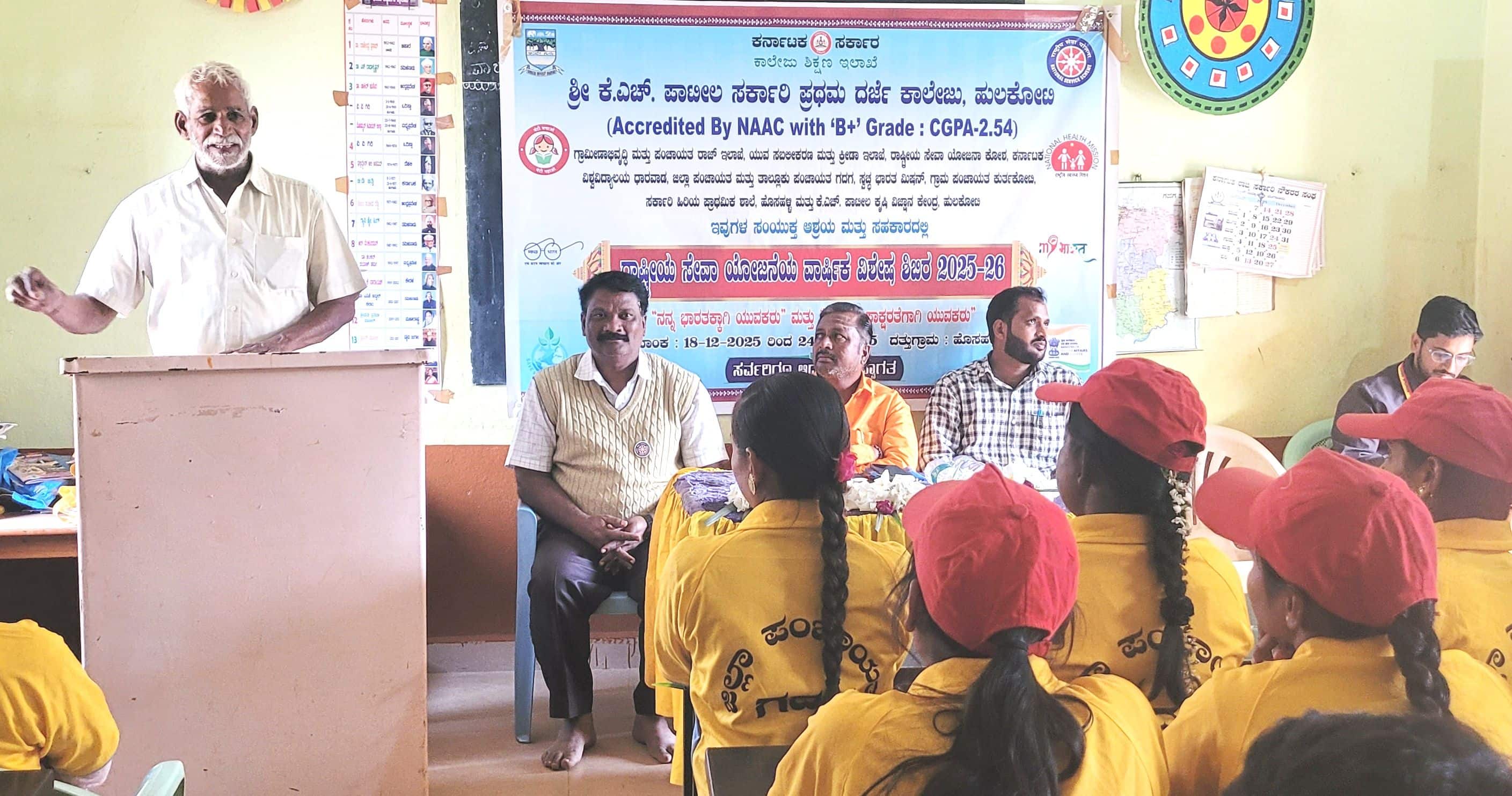 ತಾಲೂಕಿನ ಹುಲಕೋಟಿ ಗ್ರಾಮದ ಕೆ.ಎಚ್. ಪಾಟೀಲ ಸರ್ಕಾರಿ ಪ್ರಥಮದರ್ಜೆ ಕಾಲೇಜಿನ ಎನ್ಎಸ್ಎಸ್ ಘಟಕ ಹೊಸಹಳ್ಳಿ ಗ್ರಾಮದಲ್ಲಿ ಹಮ್ಮಿಕೊಂಡಿರುವ 2025- 26ನೇ ಸಾಲಿನ ವಾರ್ಷಿಕ ವಿಶೇಷ ಶಿಬಿರದಲ್ಲಿ ಮಾದಕದ್ರವ್ಯ ಮತ್ತು ಡಿಜಿಟಲ್ ವಂಚನೆ ತಡೆಗಟ್ಟುವಲ್ಲಿ ಯುವಕರ ಪಾತ್ರ ಕುರಿತು ಉಪನ್ಯಾಸ ನೀಡಿದರು.ಯುವಕರು ಸ್ಪರ್ಧಾತ್ಮಕ ಯುಗದಲ್ಲಿ ಸಾಮಾಜಿಕವಾಗಿ ಗೌರವಯುತ ಬದುಕು ಕಟ್ಟಿಕೊಳ್ಳುವುದರ ಕಡೆಗೆ ಗಮನಹರಿಸುತ್ತ, ಮಾನವೀಯ ಮೌಲ್ಯಗಳನ್ನು ಅಳವಡಿಸಿಕೊಂಡು ಸ್ವ- ಇಚ್ಛೆಯಿಂದ ಮಾದಕ ದ್ರವ್ಯ ಸೇವನೆ ಮತ್ತು ಡಿಜಿಟಲ್ ವಂಚನೆಗಳಿಂದ ದೂರವಿದ್ದರೆ ಮಾತ್ರ ಜೀವನವನ್ನು ಸಾರ್ಥಕಪಡಿಸಿಕೊಳ್ಳಲು ಸಾಧ್ಯವೆಂದರು.