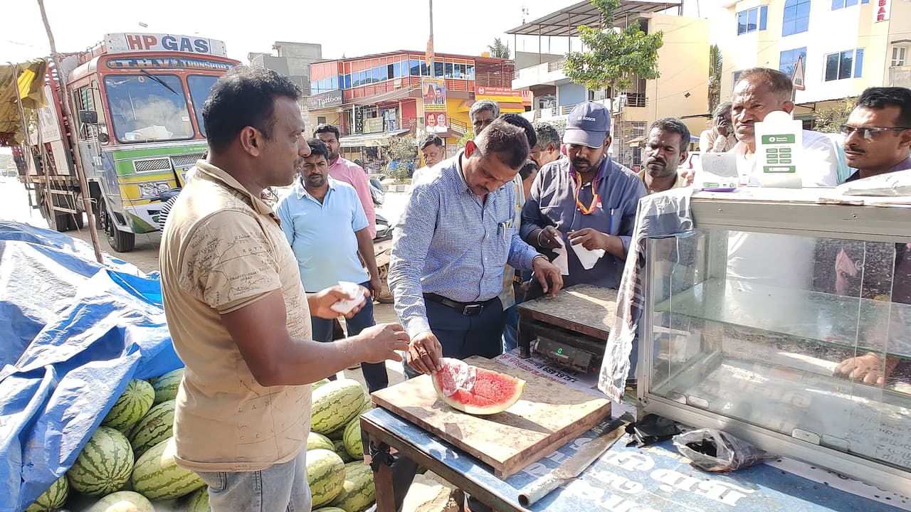 ಆಹಾರ ಸುರಕ್ಷತೆಯ ಬಗ್ಗೆ ರಾಜ್ಯ ಸರ್ಕಾರ ಸಾಕಷ್ಟು ಜಾಗೃತಿ ಮೂಡಿಸುತ್ತಿರುವ ಸಂದರ್ಭದಲ್ಲಿಯೇ ತುಮಕೂರು ಜಿಲ್ಲೆ ಕುಣಿಗಲ್ ಪಟ್ಟಣದಲ್ಲಿ ಮಾರಾಟವಾಗಿರುವ ಕಲ್ಲಂಗಡಿ ಹಣ್ಣಿನಲ್ಲಿ ಅಧಿಕ ಪ್ರಮಾಣದ ಕೆಂಪು ಬಣ್ಣ ಕಾಣಿಸಿಕೊಂಡಿದೆ.