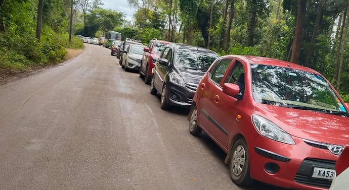 ಮುಳ್ಳಯ್ಯನಗಿರಿ, ದತ್ತಪೀಠ, ಮಾಣಿಕ್ಯಧಾರ ಭಾಗಕ್ಕೆ ಭಾರೀ ಪ್ರವಾಸಿಗರು ಆಗಮಿಸಿದ್ದರಿಂದ ಪ್ರವಾಸಿಗರು ಟ್ರಾಫಿಕ್ ಜಾಮ್ ನಲ್ಲಿ ಸಿಲುಕಿ ಪರದಾಡುವಂತಾಗಿತ್ತು. ಮುಳ್ಳಯ್ಯನಗಿರಿ ಭಾಗಕ್ಕೆ ನಿತ್ಯ1200 ವಾಹನಗಳಿಗೆ ಮಾತ್ರ ಅವಕಾಶ. ಬೆಳಗ್ಗೆ 600 ಹಾಗೂ ಮಧ್ಯಾಹ್ನ 600 ವಾಹನಗಳಿಗೆ ಜಿಲ್ಲಾಡಳಿತ ಅವಕಾಶ ಕಲ್ಪಿಸಿದೆ. ಮುಳ್ಳಯ್ಯನಗಿರಿ ಭಾಗಕ್ಕೆ ಭಾರೀ ವಾಹನಗಳು ಆಗಮಿಸಿದ ಪರಿಣಾಮ ಸುಮಾರು 4-5 ಕಿ.ಮೀ. ಟ್ರಾಫಿಕ್ ಜಾಮ್ ಆಗಿ ಪ್ರವಾಸಿಗರು ಪರದಾಡುವಂತಾಗಿತ್ತು.ಮುಳ್ಳಯ್ಯನಗಿರಿ ಮಾರ್ಗದ ಚೆಕ್ ಪೋಸ್ಟ್ ಎನ್ಎಂಡಿಸಿ ಬಳಿಯಿಂದ ಅಲ್ಲಂಪುರ ಗ್ರಾಮದವರೆಗೂ ವಾಹನಗಳು ಸರದಿ ಸಾಲಿನಲ್ಲಿ ಸಾಲುಗಟ್ಟಿ ನಿಂತಿದ್ದವು. ಮಳೆ ಮಧ್ಯೆ ಗಿರಿ ಭಾಗದಲ್ಲಿ ಪ್ರವಾಸಿಗರಿಗೆ ಯಾವುದೇ ತೊಂದರೆ, ಯಾವುದೇ ಅಪಘಾತ ಸಂಭವಿಸಬಾರದೆಂದು ಪೊಲೀಸರು ಗಿರಿ ಭಾಗಕ್ಕೆ ಹೋಗಿದ್ದ ವಾಹನಗಳು ಕೆಳಗೆ ಬಂದ ಮೇಲೆ ಬೇರೆ ವಾಹನಗಳನ್ನು ಬಿಡಲು ಮುಂದಾಗಿದ್ದರು. ಆದರೆ, ಮೇಲಿಂದ ಮೇಲೆ ಬರುತ್ತಿದ್ದ ವಾಹನಗಳನ್ನ ನಿಯಂತ್ರಿಸಲು ಪೊಲೀಸರು ಹಾಗೂ ಚೆಕ್ ಪೋಸ್ಟ್ ಸಿಬ್ಬಂದಿ ಪರದಾಡಿದರು. ಒಂದೆಡೆ ಜಿಟಿ ಜಿಟಿ ಮಳೆ. ಮತ್ತೊಂದೆಡೆ ಭಾರೀ ವಾಹನಗಳಿಂದ ಪೊಲೀಸರು ಹೈರಾಣಾಗಿದ್ದಾರೆ. 2 ಕೆಸಿಕೆಎಂ 3ಚಿಕ್ಕಮಗಳೂರಿನ ಗಿರಿ ಪ್ರದೇಶಕ್ಕೆ ತೆರಳಲು ಸಾಲುಗಟ್ಟಿ ನಿಂತಿರುವ ಪ್ರವಾಸಿಗರ ವಾಹನಗಳು.