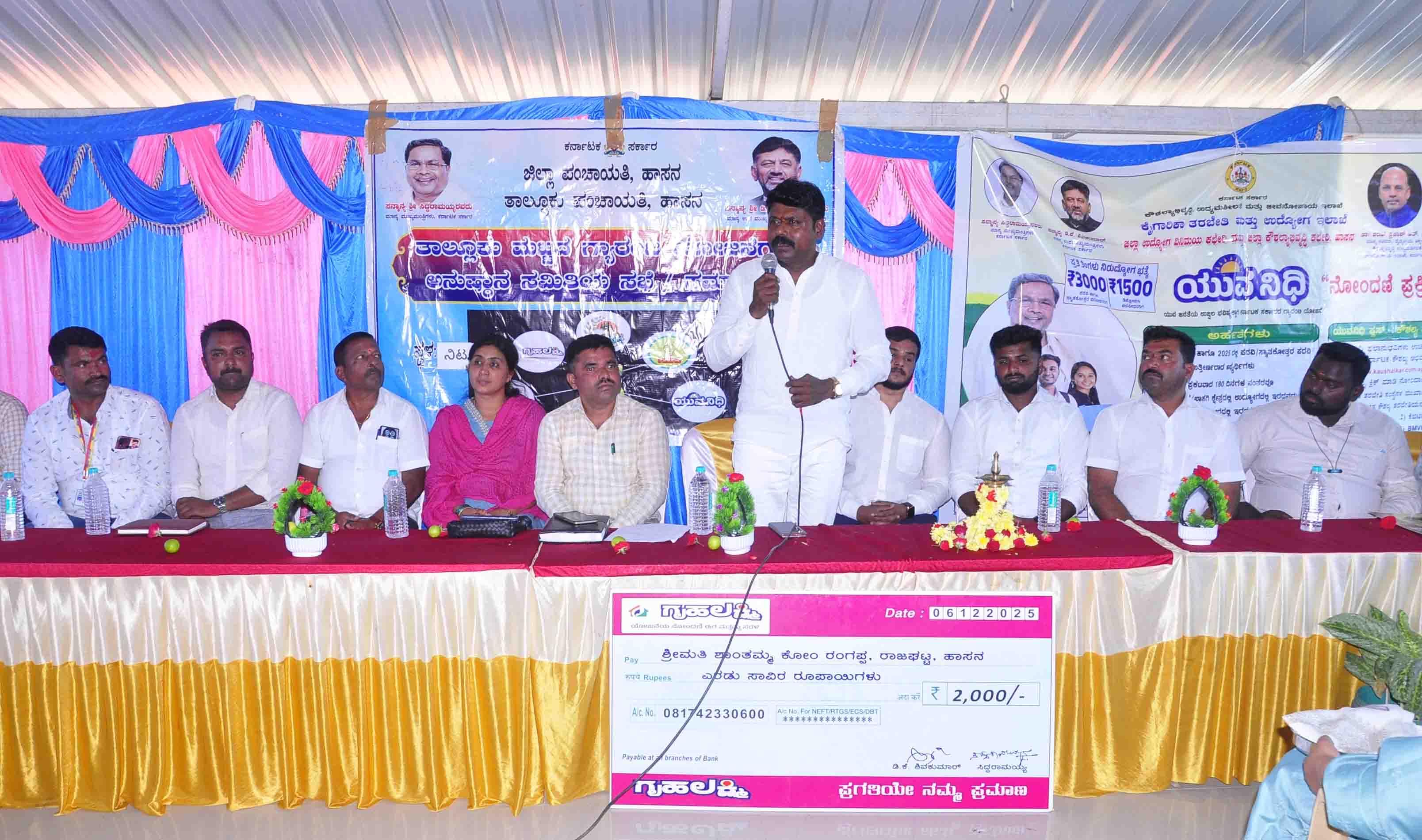 ಗ್ಯಾರಂಟಿ ಯೋಜನೆ ಆರಂಭವಾದ ೨೬ ತಿಂಗಳಲ್ಲಿ ಒಟ್ಟು ೪೬೦ ಕೋಟಿ ೮೨ ಲಕ್ಷ ಹಣ ತಾಲೂಕಿಗೆ ಬಿಡುಗಡೆಯಾಗಿದ್ದು, ಸರ್ಕಾರ ಜಾರಿಗೆ ತಂದಿರುವ ಪಂಚ ಗ್ಯಾರಂಟಿ ಯೋಜನೆಗಳನ್ನು ಸಮರ್ಪಕವಾಗಿ ಸದುಪಯೋಗಪಡಿಸಿಕೊಂಡು ಕುಟುಂಬದ ಆರ್ಥಿಕ ಸ್ಥಿತಿ ಬಲಪಡಿಸಿಕೊಳ್ಳಬೇಕು ಎಂದು ಹಾಸನ ತಾಲೂಕು ಗ್ಯಾರಂಟಿ ಸಮಿತಿ ಅಧ್ಯಕ್ಷ ಬನವಾಸೆ ರಂಗಸ್ವಾಮಿ ಕರೆ ನೀಡಿದರು.ತಾಲೂಕಿನ ನಿಟ್ಟೂರು ಗ್ರಾಮ ಪಂಚಾಯಿತಿಯಲ್ಲಿ ಜಿಲ್ಲಾ ಪಂಚಾಯಿತಿ ಹಾಗೂ ಹಾಸನ ತಾಲೂಕು ಪಂಚಾಯಿತಿ ವತಿಯಿಂದ ಆಯೋಜಿಸಲಾದ ಗ್ಯಾರಂಟಿ ಯೋಜನೆಗಳ ಮಾಹಿತಿ ಸಭೆಯನ್ನು ಜ್ಯೋತಿ ಬೆಳಗಿಸುವ ಮೂಲಕ ಉದ್ಘಾಟಿಸಿ ಅವರು ಮಾತನಾಡಿ, ಸರ್ಕಾರದ ಗೃಹ ಜ್ಯೋತಿ, ಗೃಹಲಕ್ಷ್ಮೀ, ಅನ್ನಭಾಗ್ಯ, ಯುವನಿಧಿ ಹಾಗೂ ಶಕ್ತಿ ಯೋಜನೆಗಳು ಸಮಾಜದ ವಿವಿಧ ವರ್ಗಗಳಿಗೆ ನೇರವಾಗಿ ಪ್ರಯೋಜನಕಾರಿಯಾಗಿವೆ. ವಿಶೇಷವಾಗಿ ಮಹಿಳೆಯರು ಆರ್ಥಿಕವಾಗಿ ಸ್ವಾವಲಂಬಿಗಳಾಗಲು ಗೃಹಲಕ್ಷ್ಮೀ ಯೋಜನೆ ಮಹತ್ವದ ಪಾತ್ರವಹಿಸುತ್ತಿದೆ. ಈ ಯೋಜನೆಯಿಂದ ಲಭಿಸುವ ಹಣವನ್ನು ಮಕ್ಕಳ ವಿದ್ಯಾಭ್ಯಾಸ, ಮನೆ ನಿರ್ವಹಣೆ ಹಾಗೂ ಸಣ್ಣ ಉದ್ದಿಮೆಗಳಿಗಾಗಿ ಬಳಸಿಕೊಂಡು ಮಹಿಳೆಯರು ತಮ್ಮ ಜೀವನಮಟ್ಟವನ್ನು ಸುಧಾರಿಸಿಕೊಳ್ಳುತ್ತಿದ್ದಾರೆ ಎಂದರು.