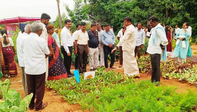 ಅಧಿಕ ಇಳುವರಿ ಪಡೆಯುವ ಉದ್ದೇಶದಿಂದ ಇಂದು ಸಾವಯವ ಕೃಷಿ ಪದ್ಧತಿಯನ್ನು ಮರೆಯುತ್ತಿದ್ದೇವೆ, ರೈತರು ಬೆಳೆಯುವ ಕೃಷಿ ಉತ್ಪನ್ನಗಳು ರಾಸಾಯನಿಕಯುಕ್ತವಾಗಿವೆ. ಆದ್ದರಿಂದ ರೈತರು ಸಾವಯವ ಕೃಷಿಗೆ ಒತ್ತು ನೀಡಿ, ಆರೋಗ್ಯಕರವಾದ ಉತ್ಪನ್ನಗಳನ್ನು ಬೆಳೆಯಬೇಕು ಎಂದು ಜಿ.ಕೆ.ವಿ.ಕೆ ಕೃಷಿ ವಿಶ್ವ ವಿದ್ಯಾಲಯದ ಡೀನ್ ಡಾ.ಎನ್.ಬಿ.ಪ್ರಕಾಶ್ ಸಲಹೆ ನೀಡಿದರು.ತಾಲೂಕಿನ ದಪ್ಪರ್ತಿ ಗ್ರಾಮದ ರೈತ ಹಾಗೂ ಡೈರಿ ಕಾರ್ಯದರ್ಶಿ ಕೃಷ್ಣಾರೆಡ್ಡಿರವರು ತಮ್ಮ ಜಮೀನಿನ ಒಂದೇ ಬಗೆಯ ಮಣ್ಣಿನಲ್ಲಿ ಸುಮಾರು 75ಕ್ಕೂ ವಿವಿಧ ಬಗೆಯ ಬೆಳೆಗಳನ್ನು ಬೆಳೆಸಿ ಸಾಧನೆ ಮಾಡಿ ತೋರಿಸಿರುವ ತೋಟದ ಬಳಿ ಕೃಷಿ ವಿಶ್ವ ವಿದ್ಯಾಲಯ ಬೆಂಗಳೂರು ಹಾಗೂ ಜಿಕೆವಿಕೆಯವರ ಸಂಯುಕ್ತ ಆಶ್ರಯದಲ್ಲಿ ಅಂತಿಮ ವರ್ಷದ ಕೃಷಿ ವಿಭಾಗದ ವಿದ್ಯಾರ್ಥಿಗಳು ಗ್ರಾಮೀಣ ಕೃಷಿ ಕಾರ್ಯನುಭವ ಅಂಗವಾಗಿ ಹಮ್ಮಿಕೊಂಡಿದ್ದ ಕೃಷಿ ಕ್ರಾಂತಿ ಕಾರ್ಯಕ್ರಮ ಉದ್ಘಾಟಿಸಿ ಮಾತನಾಡಿದರು.