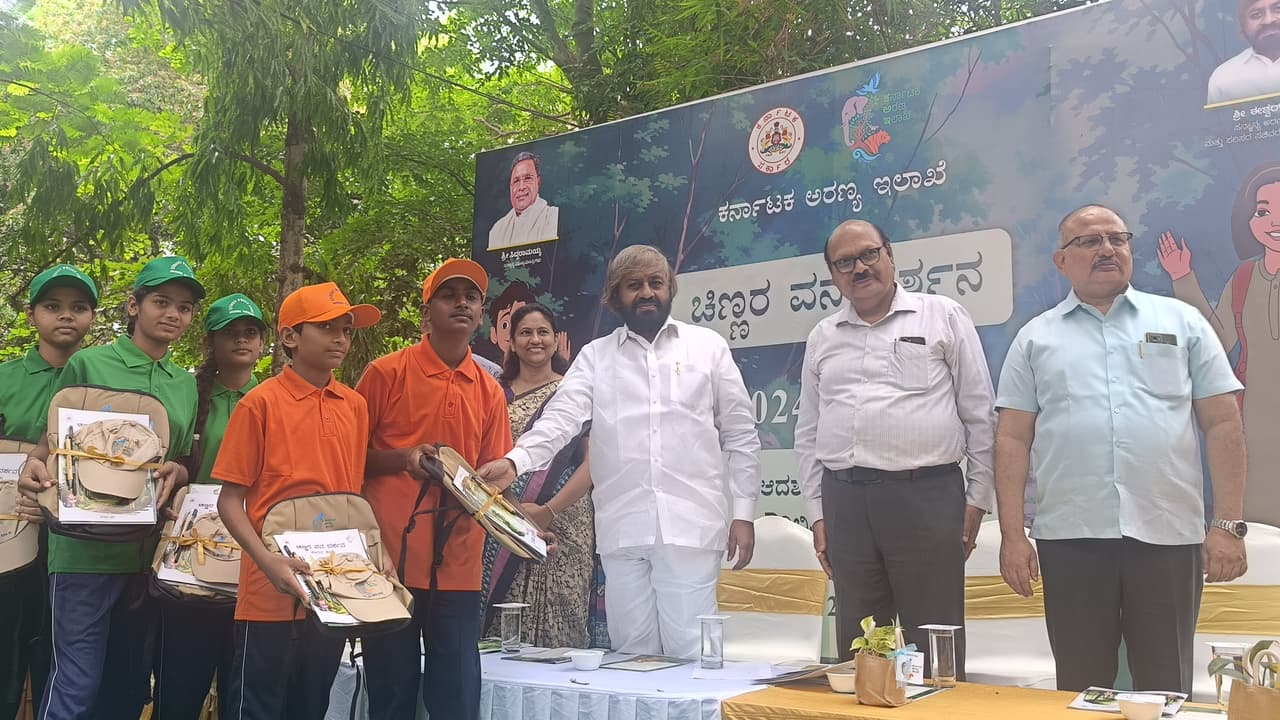 ಬನ್ನೇರಘಟ್ಟದ ಜಂಗಲ್ ಲಾಡ್ಜ್ ನಲ್ಲಿ ಆಯೋಜಿಸಿದ್ದ ಚಿಣ್ಣರ ವನದರ್ಶನದಲ್ಲಿ ಗೌರಿಬಿದನೂರಿನ ಆದರ್ಶ ವಿದ್ಯಾಲಯದ ವಿದ್ಯಾರ್ಥಿಗಳಿಗೆ ಶಾಲಾ ಮಕ್ಕಳಿಗೆ ಕಾನನ ಕಣಜ ಕಿಟ್ಟನ್ನು ಅರಣ್ಯ ಸಚಿವ ಈಶ್ವರ್.ಬಿ.ಖಂಡ್ರೆ ವಿತರಿಸಿದರು.