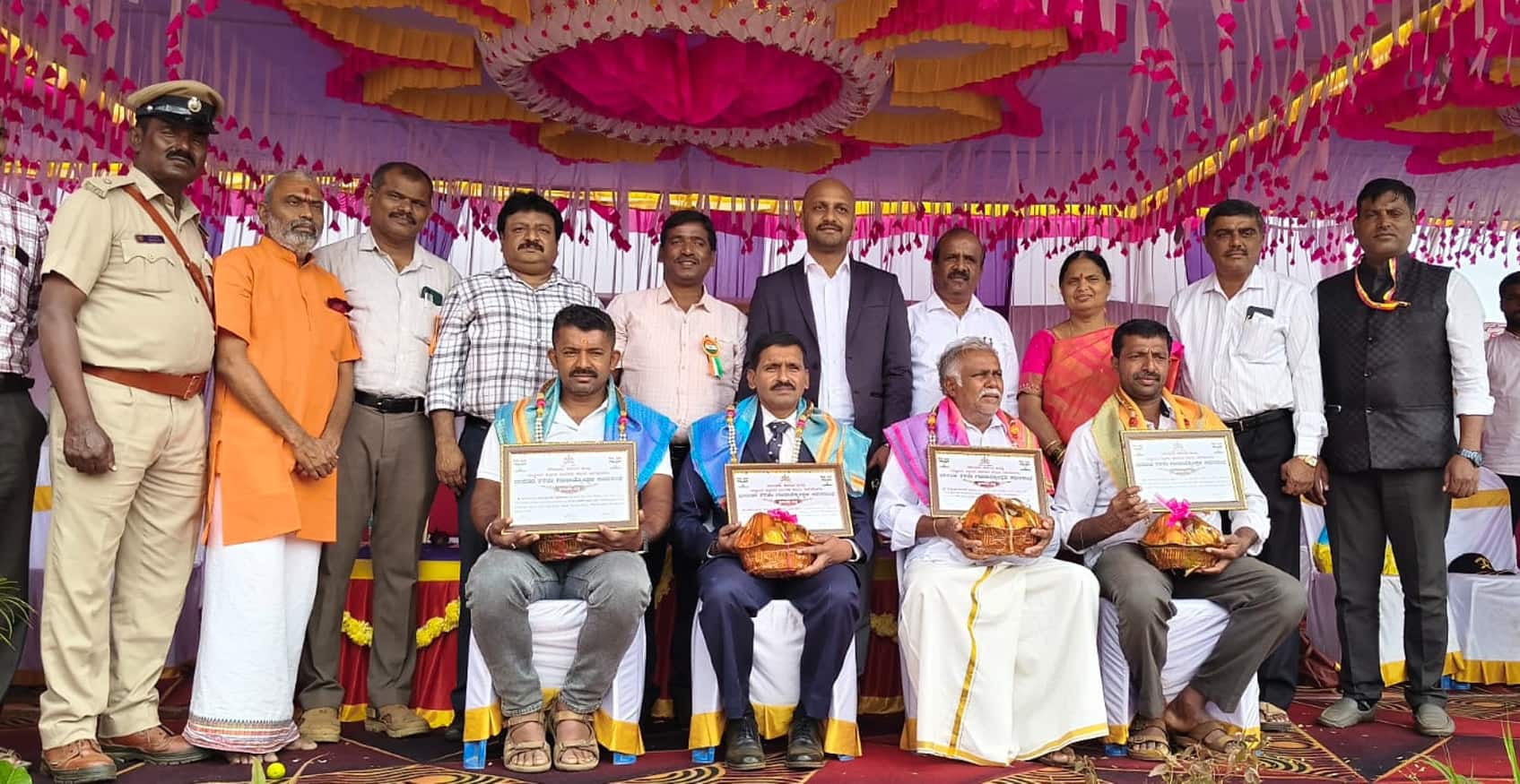 ಸಮಾರಂಭದ ವೇದಿಕೆಯಲ್ಲಿ ವಿವಿಧ ಕ್ಷೇತ್ರಗಳಲ್ಲಿ ಸಾಧನೆ ಮಾಡಿರುವ ಐವರು ಸಾಧಕರನ್ನು ತಾಲೂಕು ಆಡಳಿತದ ವತಿಯಿಂದ ಸನ್ಮಾನಿಸಲಾಯಿತು. ನಂತರ ವಿವಿಧ ಶಾಲಾ ಮಕ್ಕಳು ಸಾಂಸ್ಕೃತಿಕ ಕಾರ್ಯಕ್ರಮ ನಡೆಸಿಕೊಟ್ಟರು.ತಾಪಂ ಇಒ ಸತೀಶ್, ಡಿವೈಎಸ್ಪಿ ಬಿ.ಚಲುವರಾಜು, ಸಿಪಿಐ ಹೇಮಂತ್ ಕುಮಾರ್, ಬಿಇಒ ಲೋಕೇಶ್, ಕ್ಷೇತ್ರ ಸಮನ್ವಯಾಧಿಕಾರಿ ಕೆ.ರವೀಶ್, ಸಹಾಯಕ ಕೃಷಿ ನಿರ್ದೇಶಕ ಹರೀಶ್, ಪಶು ಇಲಾಖೆಯ ಸಹಾಯಕ ನಿರ್ದೇಶಕ ಡಾ.ಶರತ್ ರಾಜ್, ಸಿಡಿಪಿಒ ಕೃಷ್ಣಮೂರ್ತಿ, ಅಕ್ಷರ ದಾಸೋಹದ ಸಹಾಯಕ ನಿರ್ದೇಶಕ ಮಂಜುನಾಥ್, ಪುರಸಭೆ ಮುಖ್ಯಾಧಿಕಾರಿ ವೀಣಾ, ಅಗ್ನಿಶಾಮಕ ಠಾಣಾಧಿಕಾರಿ ಮಂಜುನಾಥ್, ಕನ್ನಡ ಸಂಘದ ನಟರಾಜ್ ಸೇರಿದಂತೆ ಹಲವರು ಇದ್ದರು.