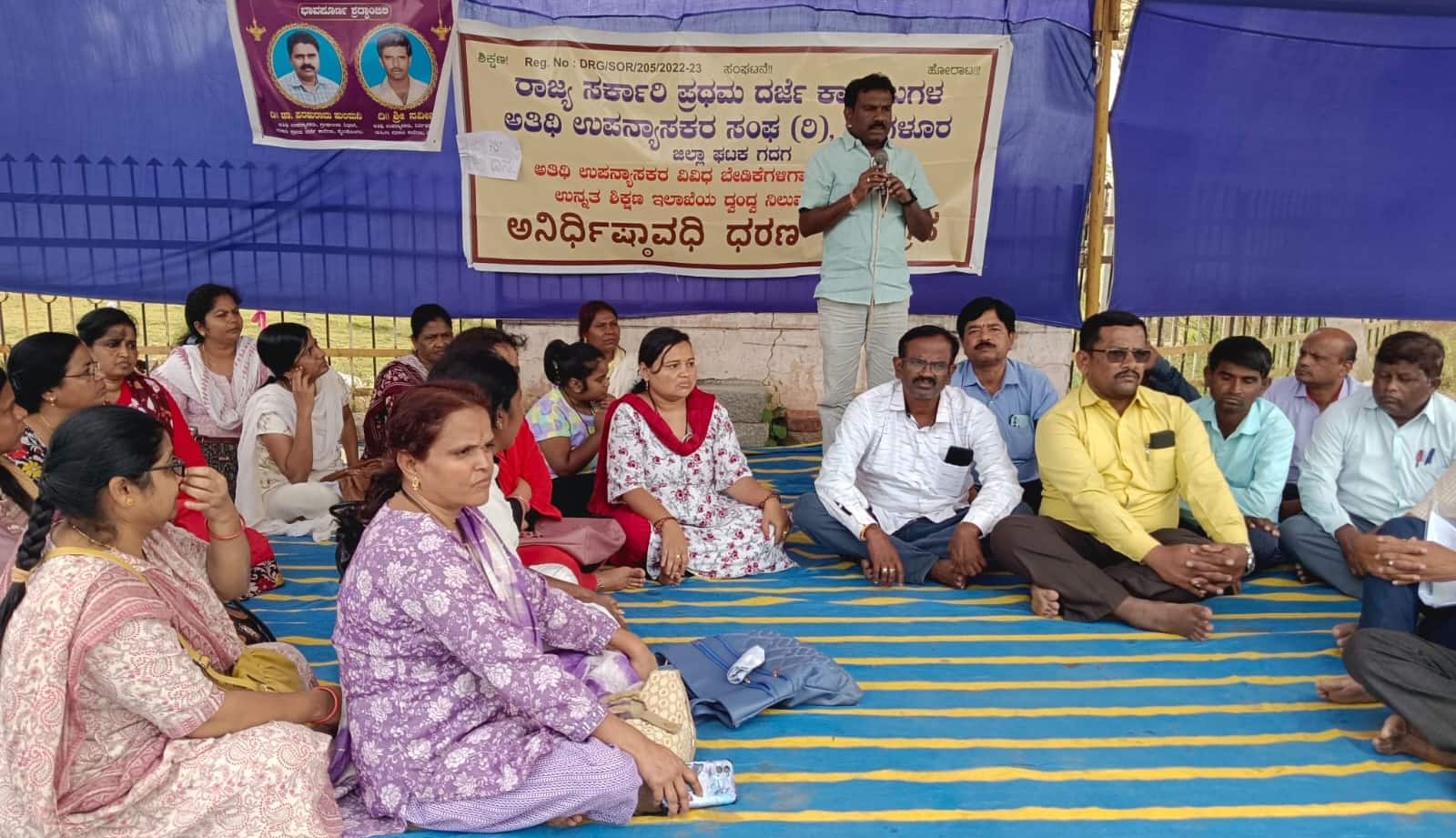 ಗದಗ: ಹಲವು ವರ್ಷಗಳಿಂದ ಸರ್ಕಾರಿ ಪ್ರಥಮದರ್ಜೆ ಕಾಲೇಜುಗಳಲ್ಲಿ ಪಾಠ ಮಾಡುತ್ತಾ ಬಂದಿರುವ 6 ಸಾವಿರ ಅತಿಥಿ ಉಪನ್ಯಾಸಕರ ಕುಟುಂಬ ಬೀದಿಗೆ ಬೀಳುವಂತಾಗಿದೆ ಸರ್ಕಾರ ಸೇವೆಯಿಂದ ಮುಂದುವರಿಸಬೇಕು ಮತ್ತು ಸೇವೆ ಸಲ್ಲಿಸಿ ಹೊರಗುಳಿದವರಿಗೂ ಅವಕಾಶ ನೀಡಬೇಕು ಎಂದು ಅತಿಥಿ ಉಪನ್ಯಾಸಕರ ಸಂಘದ ರಾಜ್ಯಾಧ್ಯಕ್ಷ ಡಾ. ಹನುಮಂತಗೌಡ ಆರ್. ಕಲ್ಮನಿ ಆಗ್ರಹಿಸಿದರು.ಸೇವೆಯಲ್ಲಿ ಇರುವ ಅತಿಥಿ ಉಪನ್ಯಾಸಕರನ್ನು ಮುಂದುವರಿಸಬೇಕು ಮತ್ತು ವಿವಿಧ ಬೇಡಿಕೆ ಈಡೇರಿಸುವಂತೆ ಆಗ್ರಹಿಸಿ ರಾಜ್ಯ ಸರ್ಕಾರಿ ಪ್ರಥಮದರ್ಜೆ ಕಾಲೇಜುಗಳ ಅತಿಥಿ ಉಪನ್ಯಾಸಕರ ಸಂಘದಿಂದ ನಗರದಲ್ಲಿ ನಡೆಯುತ್ತಿರುವ ಅತಿಥಿ ಉಪನ್ಯಾಸಕರ ಧರಣಿ ಸತ್ಯಾಗ್ರಹದಲ್ಲಿ ಮಾತನಾಡಿದರು.