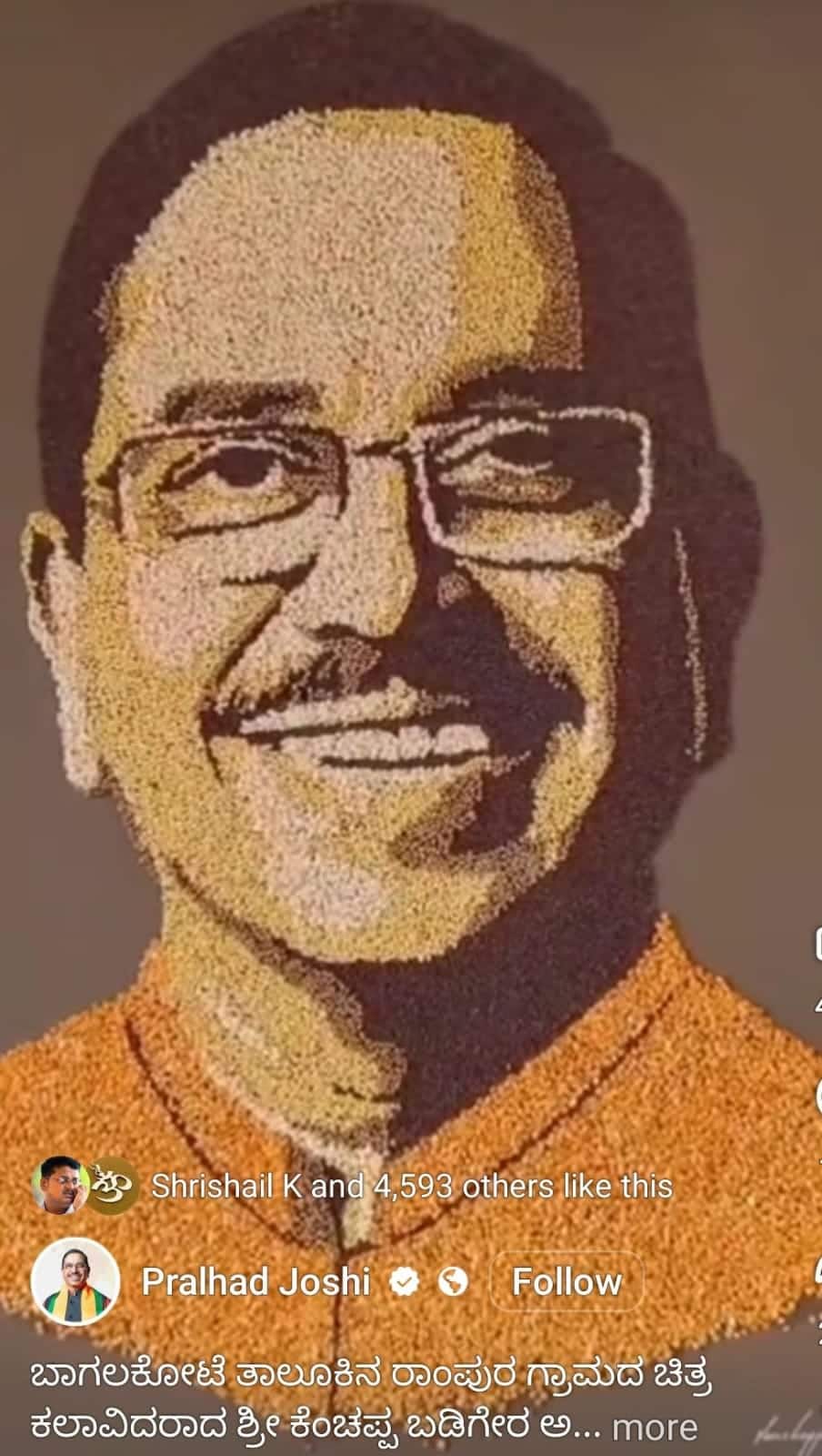 ಬಾಗಲಕೋಟೆ ತಾಲೂಕಿನ ರಾಂಪುರದ ಚಿತ್ರಕಲಾವಿದ ಕೆಂಚಪ್ಪ ಬಡಿಗೇರ ಅವರು ಧಾನ್ಯದಲ್ಲಿ ಕೇಂದ್ರ ಸಚಿವ ಪ್ರಹ್ಲಾದ್ ಜೋಷಿ ಅವರ ಚಿತ್ರ ಬಿಡಿಸಿ ಅಭಿಮಾನ ಮೆರದಿದ್ದಾರೆ.