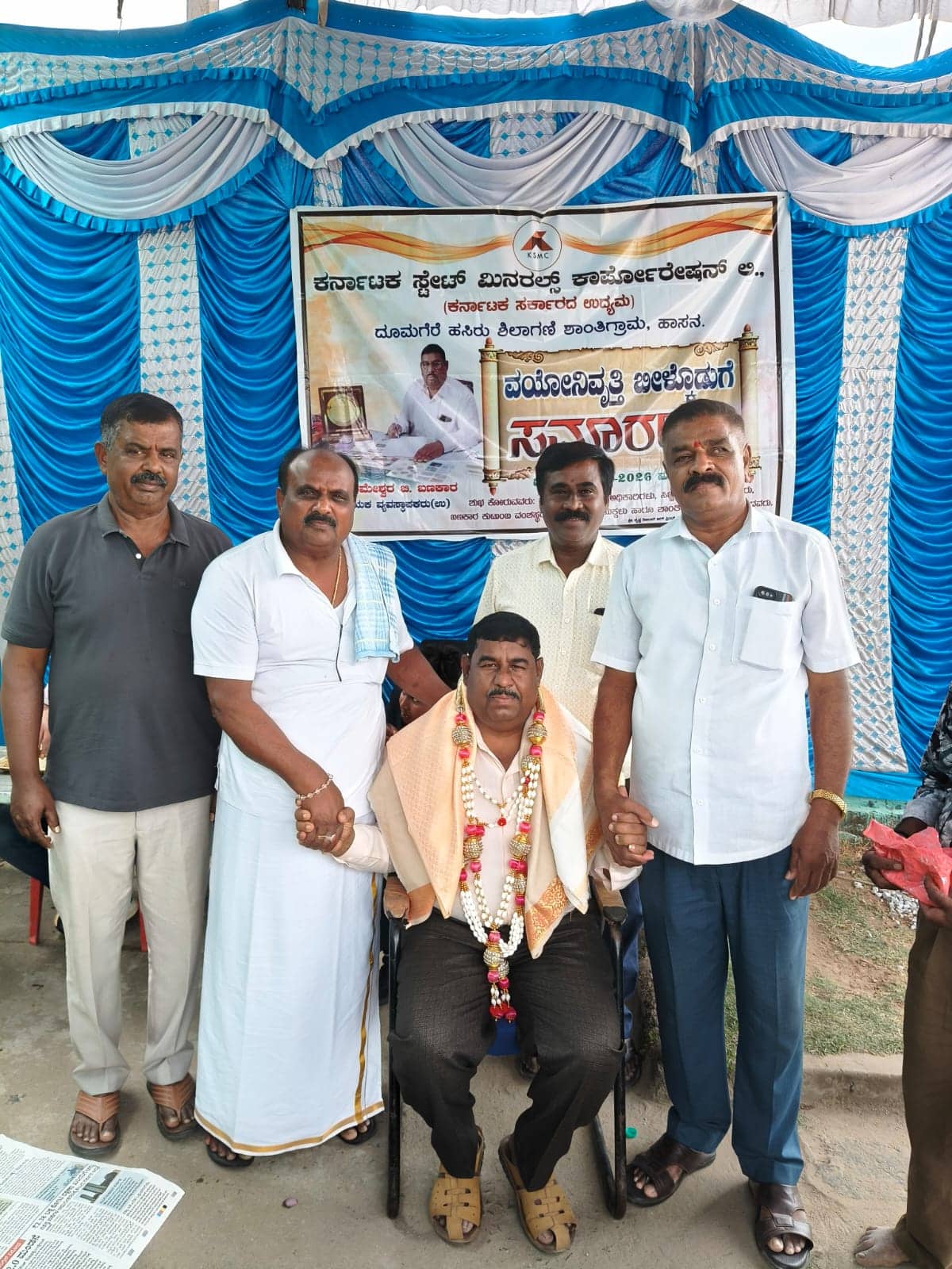 ಹಾಸನ: ಕರ್ನಾಟಕ ರಾಜ್ಯ ಮಿನರಲ್ ಕಾರ್ಪೊರೇಷನ್ ನ ದುಮ್ಮಗೆರೆ ಶಿಲಾ ಗಣಿಯ ಶಾಖೆಯಲ್ಲಿ ಸಹಾಯಕ ವ್ಯವಸ್ಥಾಪಕರಾಗಿ ಸೇವೆ ಸಲ್ಲಿಸಿ ಇತ್ತೀಚೆಗೆ ವಯೋನಿವೃತ್ತಿ ಹೊಂದಿದ ಪರಮೇಶ್ವರ ಜಿ.ಬಣಕಾರ ಅವರಿಗೆ ಶಾಂತಿಗ್ರಾಮ ಗ್ರಾಮಸ್ಥರು ಮತ್ತು ಇಲಾಖೆಯ ಸಿಬ್ಬಂದಿ ಆತ್ಮೀಯ ಬೀಳ್ಕೊಡುಗೆ ನೀಡಿದರು.ಸಮಾರಂಭದ ಅಧ್ಯಕ್ಷತೆಯನ್ನು ಹಾಸನ ಜಿಲ್ಲೆ ಮಾಜಿ ಸೈನಿಕರ ಸಂಘದ ಅಧ್ಯಕ್ಷರಾದ ಜಿ.ಎಲ್. ನಾಗರಾಜ ವಹಿಸಿ, ಬಣಕಾರ ಅವರ ದೀರ್ಘಾವಧಿ ಸೇವೆಯಲ್ಲಿ ಉತ್ತಮ ಕೆಲಸಗಳನ್ನು ಮಾಡಿದ್ದು, ಅವರ ಸೇವಾ ಮನೋಭಾವ, ಪ್ರಾಮಾಣಿಕತೆ ಮತ್ತು ಜನ ಸ್ನೇಹಿ ಕಾರ್ಯಶೈಲಿ ಎಲ್ಲರಿಗೂ ಮಾದರಿಯಾಗಿದೆ ಎಂದು ಶ್ಲಾಘಿಸಿದರು. ಮುಂದುವರಿದು ಮಾತನಾಡಿದ ಅವರು , ಬಣಕಾರರು ಶಾಂತಿಗ್ರಾಮದ ಶ್ರೀ ಆದಿ ಹನುಮಂತರಾಯ ಹಾಗೂ ಗರುಡುಗಂಬ ಪ್ರತಿಷ್ಠಾಪಿಸಿ ಶಾಂತಿಗ್ರಾಮ ಜನರ ಪ್ರೀತಿ ವಿಶ್ವಾಸಕ್ಕೆ ಪಾತ್ರರಾಗಿದ್ದಾರೆ ಎಂದು ತಿಳಿಸಿದರು.ವಯೋನಿವೃತ್ತಿ ಹೊಂದಿದ ಪರಮೇಶ್ವರ ಜಿ. ಬಣಕಾರ ಅವರನ್ನು ಶಾಲು ಹೊದಿಸಿ, ಸ್ಮರಣೆಕೆ ನೀಡಿ, ಹೂಗುಚ್ಚ ನೀಡಿ ಸನ್ಮಾನಿಸಲಾಯಿತು.