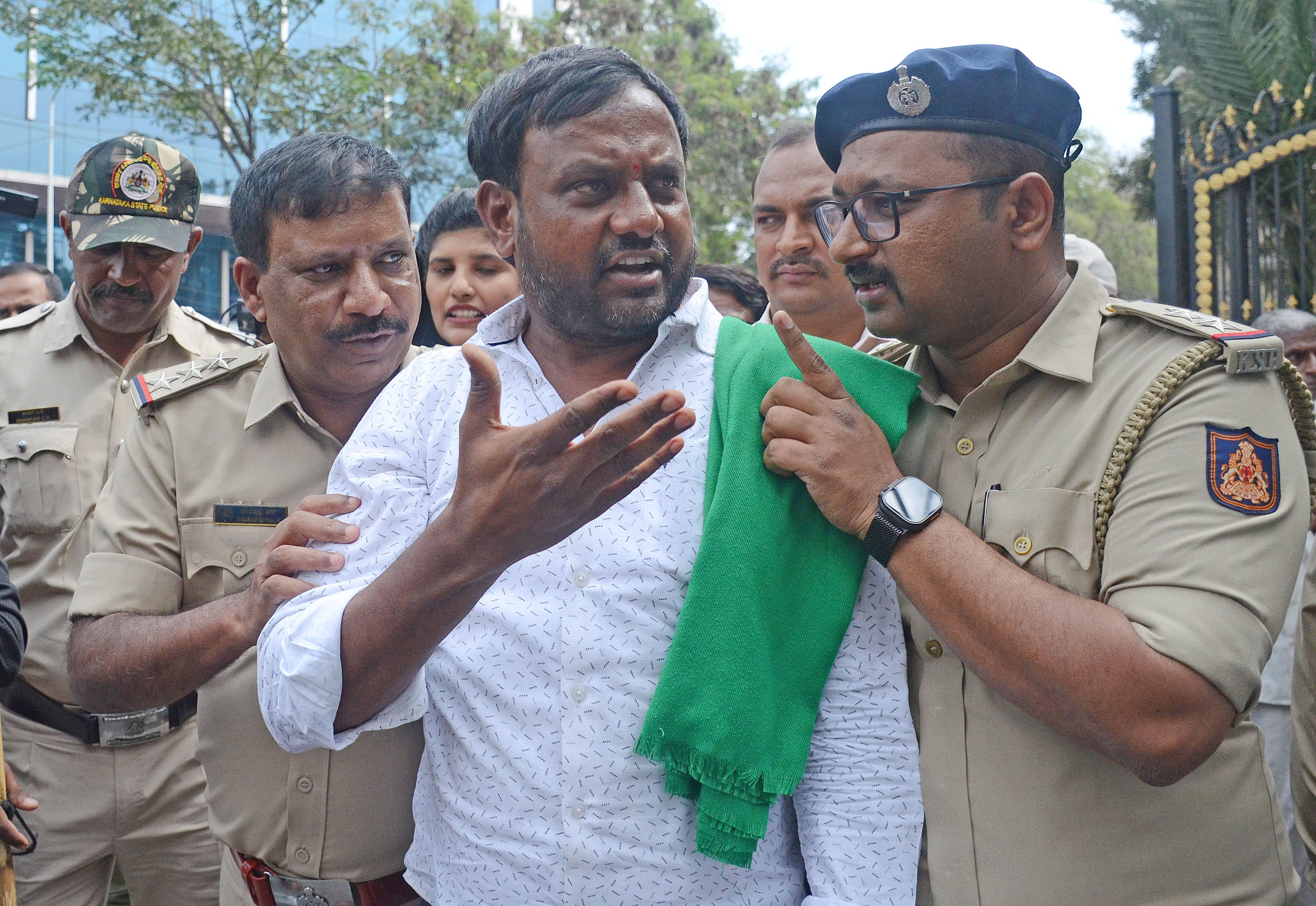 ಪೆರಿಫೆರಲ್ ರಿಂಗ್ ರೋಡ್ ಯೋಜನೆಗೆ ವಶಪಡಿಸಿಕೊಳ್ಳಲಾದ ಭೂಮಿಗೆ 2013ರ ಭೂಸ್ವಾಧೀನ ಕಾಯ್ದೆಯನ್ವಯ ಸೂಕ್ತ ಪರಿಹಾರ ನೀಡುವ ಸಂಬಂಧ ರೈತರು, ಸಂತ್ರಸ್ತರು ಮಂಗಳವಾರ ಬಿಡಿಎ ಆವರಣದಲ್ಲಿ ಧರಣಿ ನಡೆಸಲು ಮುಂದಾದಾಗ ಪೊಲೀಸರು ವಶಕ್ಕೆ ಪಡೆದರು.