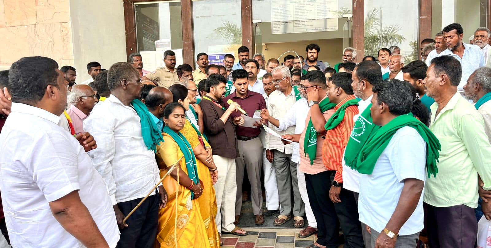 ರಾಜ್ಯ ರೈತ ಸಂಘದ ಸಂಚಾಲಕ ಚೀಲೂರು ಮುನಿರಾಜು ಮಾತನಾಡಿ, ತಾಲೂಕು ಕಚೇರಿಯಲ್ಲಿ ಹಲವಾರು ವರ್ಷಗಳಿಂದ ಒಂದೇ ಕಡೇ ಕಂದಾಯ ಅಧಿಕಾರಿಗಳು ಬೀಡು ಬಿಟ್ಟಿದ್ದಾರೆ. ಈ ಅಧಿಕಾರಿಗಳು ತಮ್ಮ ಕೇಂದ್ರ ಸ್ಥಾನದಲ್ಲಿ ಕರ್ತವ್ಯ ನಿರ್ವಹಿಸಬೇಕು. ಆದರೆ ಸರ್ಕಾರದ ಎಲ್ಲಾ ನಿಯಮಗಳನ್ನು ಉಲ್ಲಂಘಿಸಿ ತಾಲೂಕು ಕೇಂದ್ರಗಳಲ್ಲಿ ಖಾಸಗಿ ಮನೆ ಮಾಡಿಕೊಂಡು ದಲ್ಲಾಳಿಗಳ ಮೂಲಕ ಅಕ್ರಮ ದಂಧೆ ನಡೆಸುತ್ತಿದ್ದಾರೆ. ರೈತರನ್ನು ಕಚೇರಿಗೆ ಅಲೆದಾಡಿಸುತ್ತಿದ್ದಾರೆ, ಹಲವಾರು ವರ್ಷಗಳಿಂದ ಒಂದೇ ಕಡೆ ಬೇರೂರಿರುವ ಭ್ರಷ್ಟ ಅಧಿಕಾರಿಗಳನ್ನು ಬದಲಾವಣೆ ಮಾಡುವವರೆಗೂ ತಾಲೂಕಿನ ರೈತನ ಕೆಲಸವಾಗದು ಎಂದು ಹೇಳಿದರು. ಪ್ರತಿಭಟನೆಯಲ್ಲಿ ರೈತ ಸಂಘದ ರಾಜ್ಯ ಉಪಾಧ್ಯಕ್ಷ ಕೆ.ಮಲ್ಲಯ್ಯ, ಜಿಲ್ಲಾ ಗೌರವಾಧ್ಯಕ್ಷ ತಿಮ್ಮೇಗೌಡ, ರಾಜ್ಯ ಮಹಿಳಾ ಕಾರ್ಯದರ್ಶಿ ರಮ್ಯಾ ರಾಮಣ್ಣ, ಯುವ ಜಿಲ್ಲಾಧ್ಯಕ್ಷ ರವಿಕುಮಾರ್, ಜಿಲ್ಲಾ ಮಹಿಳಾ ಅಧ್ಯಕ್ಷೆ ರತ್ನಮ್ಮ, ಜಿಲ್ಲಾ ಕಾರ್ಯಾಧ್ಯಕ್ಷ ಪುಟ್ಟಸ್ವಾಮಿ, ಜಿಲ್ಲಾ ಕಾರ್ಯದರ್ಶಿ ಎಚ್.ನಾಗೇಶ್, ಜಿಲ್ಲಾ ಪ್ರಧಾನ ಕಾರ್ಯದರ್ಶಿ ನಾಗರಾಜು, ನಗರಸಭಾ ಮಾಜಿ ಸದಸ್ಯ ಸ್ಟುಡಿಯೋ ಚಂದ್ರು, ಸಾಮಾಜಿಕ ಹೋರಾಟಗಾರ ಹೊಸದುರ್ಗ ಪ್ರಶಾಂತ್ ಸೇರಿದಂತೆ ರೈತ ಮುಖಂಡರು, ಪಾಲ್ಗೊಂಡಿದ್ದರು.ಕೆ ಕೆ ಪಿ ಸುದ್ದಿ 02: