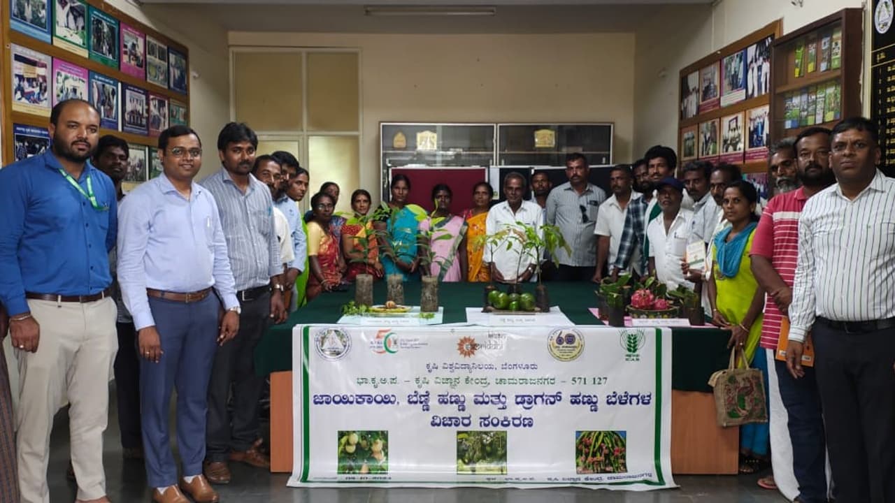 ರೈತರು ಅಧಿಕ ಲಾಭ ಗಳಿಸಲು ವಾಣಿಜ್ಯ ಬೆಳೆಗಳಾದ ಜಾಯಿಕಾಯಿ, ಬೆಣ್ಣೆ ಹಣ್ಣು ಮತ್ತು ಡ್ರ್ಯಾಗನ್ ಹಣ್ಣಿನ ಬೇಸಾಯವನ್ನು ಕೈಗೊಳ್ಳಲು ಮುಂದಾಗಬೇಕು ಎಂದು ಕೆವಿಕೆ ಮುಖ್ಯಸ್ಥ ಡಾ.ಜಿ.ಎಸ್.ಯೋಗೇಶ್ ಸಲಹೆ ನೀಡಿದರು.ಕೃಷಿ ವಿಜ್ಞಾನ ಕೇಂದ್ರಗಳ ಸುವರ್ಣ ಮಹೋತ್ಸವ ಮತ್ತು ಕೃಷಿ ವಿಶ್ವವಿದ್ಯಾಲಯ, ಬೆಂಗಳೂರಿನ ವಜ್ರ ಮಹೋತ್ಸವದ ಅಂಗವಾಗಿ ಹರದನಹಳ್ಳಿ ಫಾರಂ ಕೆವಿಕೆಯಲ್ಲಿ ತೆಂಗು ಮತ್ತು ಅಡಿಕೆ ತೋಟಗಳಲ್ಲಿ ಲಾಭದಾಯಕ ವಾಣಿಜ್ಯ ಅಂತರ ಬೆಳೆಗಳ ಬೇಸಾಯ ಕುರಿತಾದ ಬೆಳೆ ವಿಚಾರ ಸಂಕಿರಣದಲ್ಲಿ ಮಾತನಾಡಿದರು.
