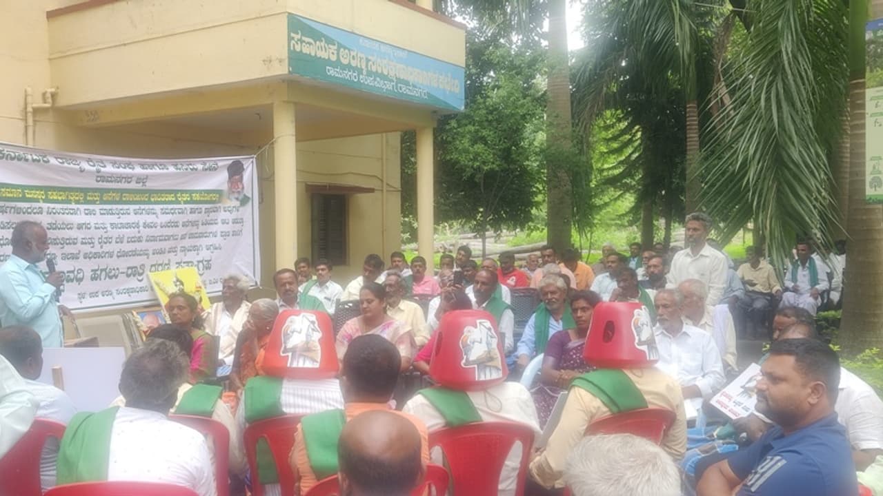ರಾಮನಗರದ ಅರಣ್ಯ ಇಲಾಖೆ ಕಚೇರಿ ಎದುರು ರೈತರು ಧರಣಿ ಸತ್ಯಾಗ್ರಹ ನಡೆಸಿದರು.