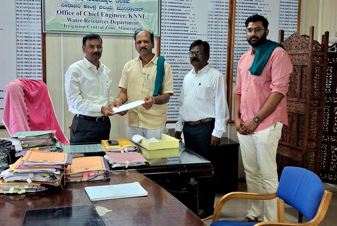 ತುಂಗಭದ್ರಾ ರೈತ ಸಂಘದ ಅಧ್ಯಕ್ಷ ಡಾ. ಪುರುಷೋತ್ತಮಗೌಡ, ದರೂರ್ ಸಾಗರ ಗೌಡ ಮತ್ತಿತರರಿದ್ದರು.ತುಂಗಭದ್ರ ರೈತ ಸಂಘದಿಂದ ಮುನಿರಾಬಾದ್ನ ನೀರಾವರಿ ಇಲಾಖೆಯ ಮುಖ್ಯ ಅಭಿಯಂತರ ಲಕ್ಷ್ಮಣ ನಾಯ್ಕಗೆ ಮನವಿಪತ್ರ ಸಲ್ಲಿಸಲಾಯಿತು.