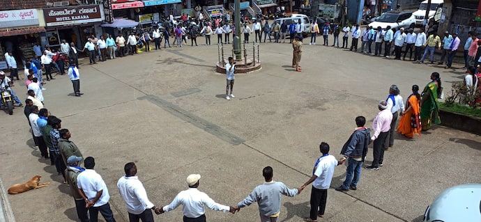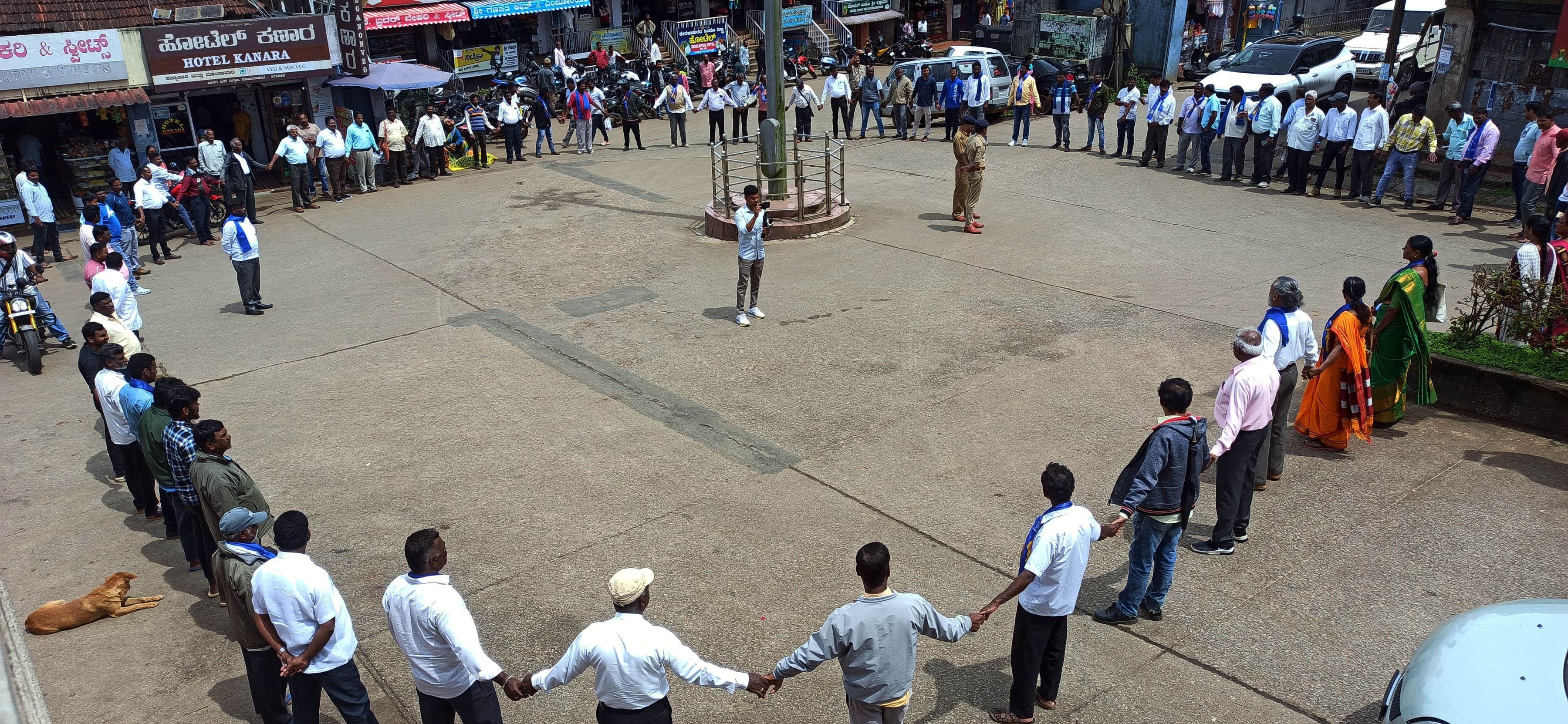 ಕೊಡಗು ಜಿಲ್ಲಾ ಹಿತರಕ್ಷಣಾ ಒಕ್ಕೂಟ ಪಟ್ಟಣದ ಪುಟ್ಟಪ್ಪ ವೃತ್ತದಲ್ಲಿ ಮಾನವ ಸರಪಳಿ ರಚಿಸಿ ಪ್ರತಿಭಟನೆ ನಡೆಸಿತು.