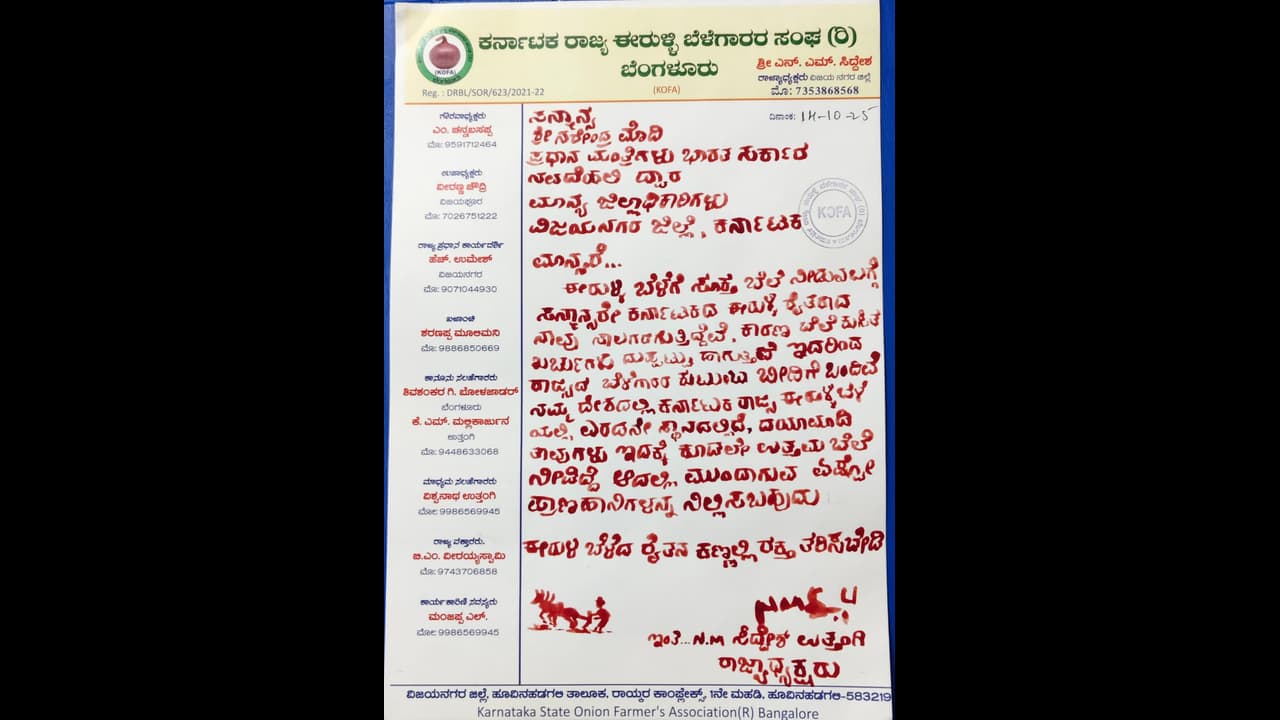ಹೊಸಪೇಟೆ: ಈರುಳ್ಳಿ ಬೆಳೆಗೆ ಸೂಕ್ತ ಬೆಂಬಲ ಬೆಲೆ ನೀಡಿ ರೈತರನ್ನು ಉಳಿಸಬೇಕು ಎಂದು ಆಗ್ರಹಿಸಿ ಈರುಳ್ಳಿ ಬೆಳೆಗಾರರ ಸಂಘದ ರಾಜ್ಯಾಧ್ಯಕ್ಷ ಎನ್.ಎಂ. ಸಿದ್ದೇಶ್ ಅವರು ರಕ್ತದಲ್ಲಿ ಪ್ರಧಾನಿ ನರೇಂದ್ರ ಮೋದಿ ಅವರಿಗೆ ಮಂಗಳವಾರ ಮನವಿ ಪತ್ರ ಬರೆದಿದ್ದಾರೆ.ಇಲ್ಲಿನ ಜಿಲ್ಲಾಧಿಕಾರಿಗಳ ಕಚೇರಿಯಲ್ಲಿ ಅಪರ ಜಿಲ್ಲಾಧಿಕಾರಿ ಇ. ಬಾಲಕೃಷ್ಣಪ್ಪ ಅವರ ಮೂಲಕ ಮಂಗಳವಾರ ಪ್ರಧಾನಮಂತ್ರಿ ಮೋದಿಗೆ ಅವರಿಗೆ ರಕ್ತದಲ್ಲಿ ಬರೆದಿರುವ ಮನವಿ ಪತ್ರವನ್ನು ರವಾನಿಸಿದರು.ಈರುಳ್ಳಿ ಬೆಳೆಗೆ ಸೂಕ್ತ ಬೆಲೆ ನಿಗದಿಸಿ ಪಿಡಿಪಿಎಸ್ ಯೋಜನೆಯ ಮೂಲಕ ಬೆಲೆ ಕೊರತೆ ಪಾವತಿ ಮೊತ್ತ ನೀಡಬೇಕು. ಬೆಂಬಲ ಬೆಲೆಯೊಂದಿಗೆ ಖರೀದಿ ಕೇಂದ್ರ ತೆರೆಯಬೇಕು. ಈರುಳ್ಳಿ ಬೆಳೆಯ ಬೆಲೆ ಕುಸಿದು ಈರುಳ್ಳಿ ಬೆಳೆದ ರೈತರು ಸಾಲಗಾರರಾಗುತ್ತಿದ್ದಾರೆ. ಬೆಳೆಗೆ ಖರ್ಚು ಮಾಡಿದ ಹಣವೂ ವಾಪಸ್ ಬಾರದೆ ರಾಜ್ಯದಲ್ಲಿ ಈರುಳ್ಳಿ ಬೆಳೆಗಾರರ ಕುಟುಂಬಗಳು ಬೀದಿಗೆ ಬಂದಿವೆ.