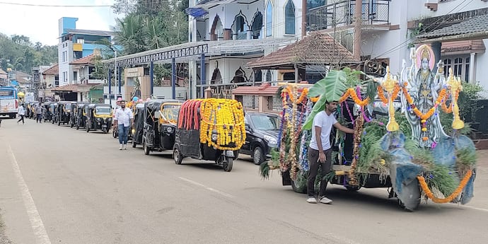 ಇದಕ್ಕೂ ಮುನ್ನ ಹಳೆ ತಾಲೂಕಿನಲ್ಲಿ ಅಲಂಕೃತ ವಾಹನಗಳ ಮೆರವಣಿಗೆಯ ಉದ್ಘಾಟನೆ ನಡೆಯಿತು. ಕಾಫಿ ಬೆಳೆಗಾರ ಬೊಳ್ಳಚೆಟ್ಟೀರ ಸುರೇಶ್ ಕಾರ್ಯಕ್ರಮವನ್ನು ಉದ್ಘಾಟಿಸಿ ಮಾತನಾಡಿ ವಾಹನ ಚಾಲಕ ಮತ್ತು ಮಾಲೀಕರ ಸಂಘದ ವತಿಯಿಂದ ಆಯೋಜಿಸಲಾಗಿರುವ ಕಾರ್ಯಕ್ರಮ ಜನಾಂಗದ ಸಾಮರಸ್ಯಕ್ಕೆ ಕಾರಣವಾಗಲಿ ಎಂದರು. ಬಳಿಕ ಅಲಂಕೃತ ವಾಹನಗಳ ಅದ್ದೂರಿ ಮೆರವಣಿಗೆ ಪಟ್ಟಣದ ಮುಖ್ಯ ರಸ್ತೆಯಲ್ಲಿ ಸಾಗಿ ಮಾರುಕಟ್ಟೆ ಆವರಣದಲ್ಲಿ ವಾಹನಗಳ ಸಾಮೂಹಿಕ ಆಯುಧ ಪೂಜೆ ನಡೆಯಿತು. ಅರ್ಚಕ ಹರೀಶ್ ಭಟ್ ಪೂಜಾ ಕಾರ್ಯಕ್ರಮವನ್ನು ನೆರವೇರಿಸಿದರು.ವಿವಿಧ ವಿಭಾಗಗಳಲ್ಲಿ ವಿಜೇತರಾದ ಅಲಂಕೃತ ವಾಹನಗಳ ಚಾಲಕರಿಗೆ ಗಣ್ಯರು ಟ್ರೋಫಿ ಹಾಗೂ ಬಹುಮಾನಗಳನ್ನು ವಿತರಿಸಿದರು.ವಿಜೇತರು: ದ್ವಿಚಕ್ರವಾಹನ: ಪ್ರಥಮ ಕೆಎ 03ಜೆ 0491, ದ್ವಿತೀಯ ಕೆಎ 12 ವಿ 6319, ತೃತಿಯ ಕೆಎ 12 ಎನ್ 1472, ತ್ರಿ ಚಕ್ರವಾಹನ ಪ್ರಥಮ ಕೆಎ 12 0799, ದ್ವಿತೀಯ 7978, ತೃತೀಯ ಕೆಎ 12 ಸಿ 0753,