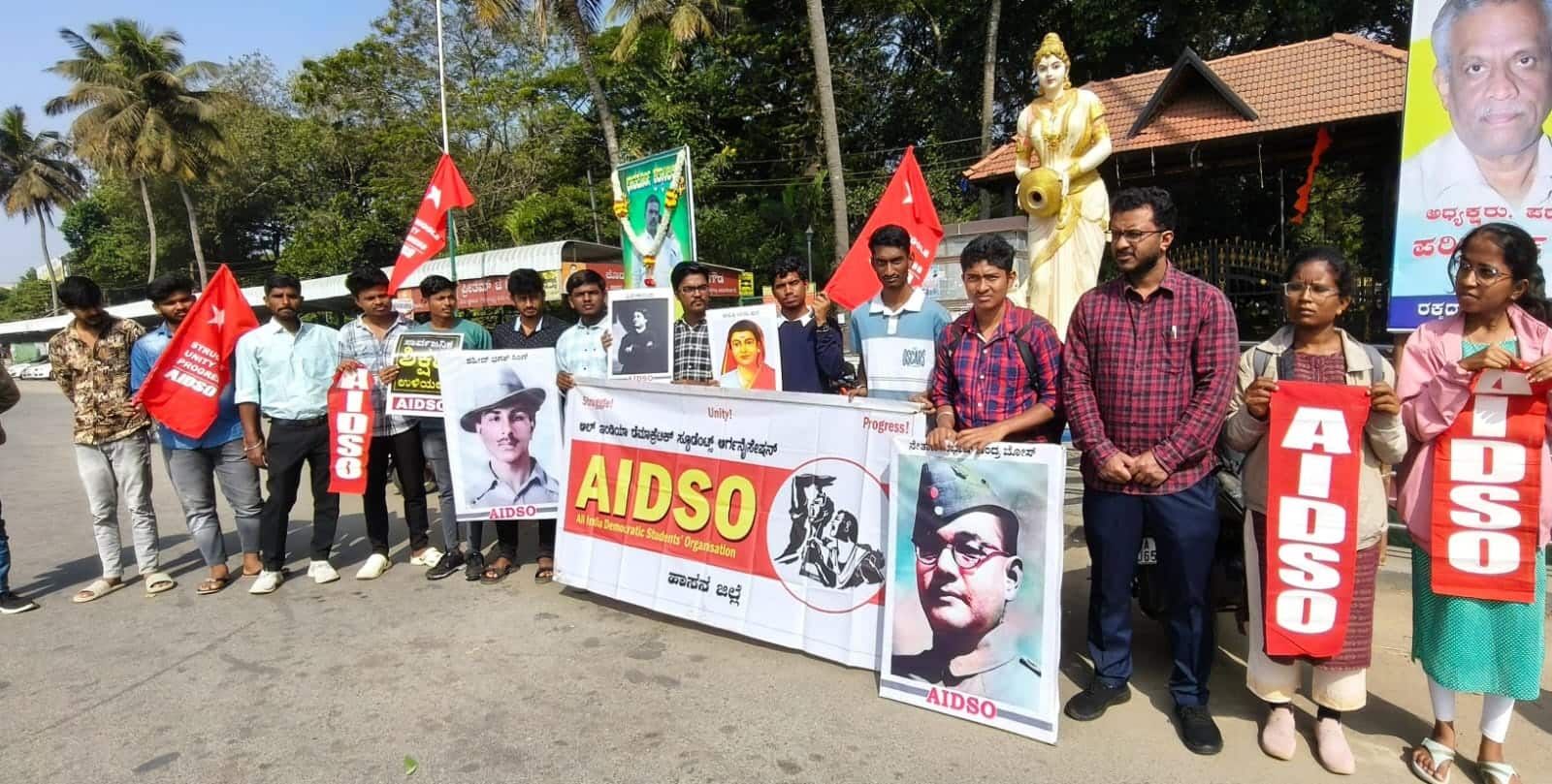 ಎಐಡಿಎಸ್ಒ 72ನೇ ಸಂಸ್ಥಾಪನಾ ದಿನದಂದು ಹಾಸನ ನಗರದ ಹೇಮಾವತಿ ಪ್ರತಿಮೆ ಬಳಿ ಸರ್ಕಾರಿ ಶಾಲೆಗ ಮುಚ್ಚು ನೀತಿಗಳ ವಿರುದ್ಧ ಘೋಷಣೆ ಕೂಗಲಾಯಿತು.