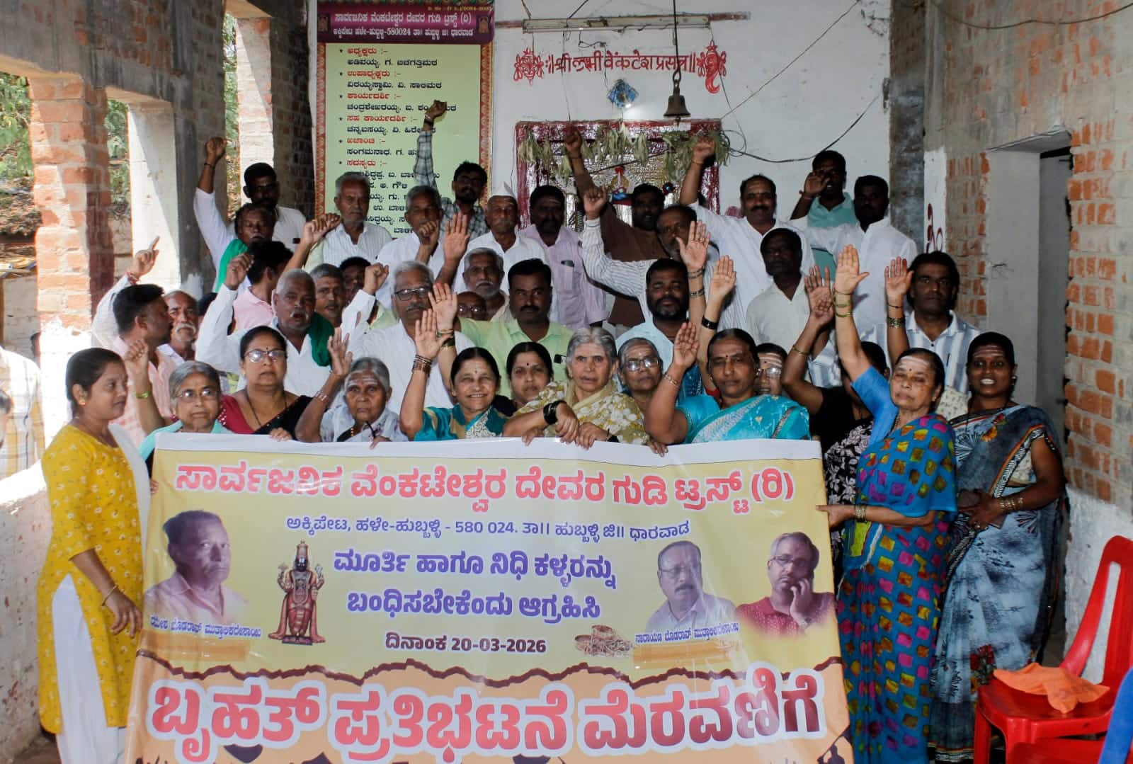 ನಿಧಿ ದುರಾಸೆಗಾಗಿ ನಗರದ ಅಕ್ಕಿಪೇಟೆ ವೆಂಕಟೇಶ್ವರ ದೇವಸ್ಥಾನದ ವೆಂಕಟೇಶ ಮೂರ್ತಿಯನ್ನು ಭಗ್ನಗೊಳಿಸಿದ್ದಲ್ಲದೇ ಮೂರ್ತಿಯನ್ನು ಕಳ್ಳತನ ಮಾಡಿರುವ ವ್ಯಕ್ತಿಗಳ ಬಂಧನಕ್ಕೆ ಒತ್ತಾಯಿಸಿ ಹಳೇಹುಬ್ಬಳ್ಳಿಯ ಸಾರ್ವಜನಿಕರು ಹಾಗೂ ವೆಂಕಟೇಶ್ವರ ದೇವಸ್ಥಾನದ ಭಕ್ತರು ಇತ್ತೀಚೆಗೆ ಪ್ರತಿಭಟನೆ ನಡೆಸಿದರು.