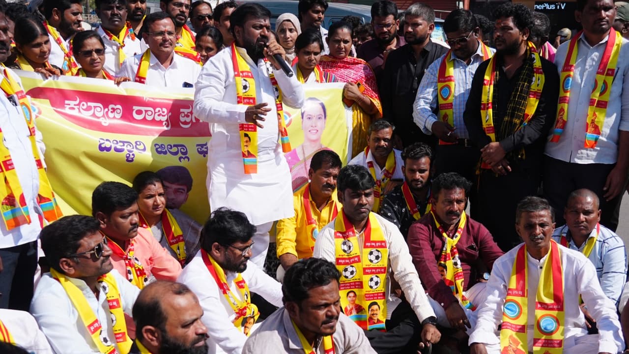 ಬಳ್ಳಾರಿ: ಗಂಗಾವತಿ ಶಾಸಕ ಜಿ. ಜನಾರ್ದನ ರೆಡ್ಡಿ ಅವರ ಕುಟೀರಕ್ಕೆ ಬೆಂಕಿ ಹಚ್ಚಿದ ಕಿಡಿಗೇಡಿಗಳ ವಿರುದ್ಧ ಕಠಿಣ ಕ್ರಮ ಜರುಗಿಸಬೇಕು ಎಂದು ಆಗ್ರಹಿಸಿ ಕಲ್ಯಾಣ ರಾಜ್ಯ ಪ್ರಗತಿ ಪಕ್ಷದ ಕಾರ್ಯಕರ್ತರು ನಗರದಲ್ಲಿ ಗುರುವಾರ ಪ್ರತಿಭಟನೆ ನಡೆಸಿದರು.