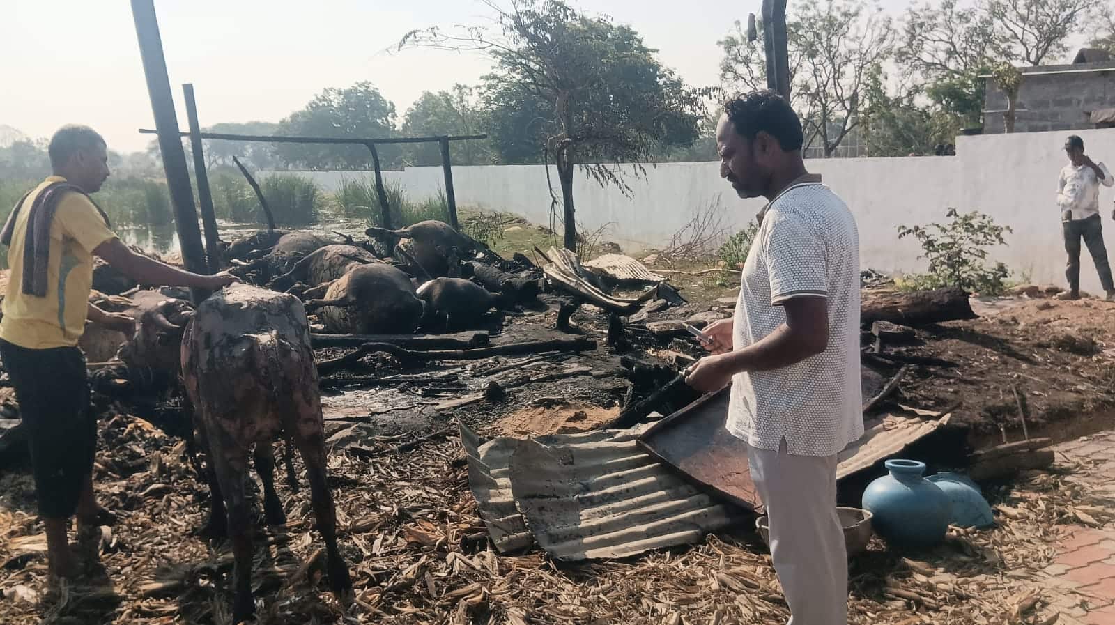 ಹಾವೇರಿ:ವಿದ್ಯುತ್ ಶಾರ್ಟ್ಸರ್ಕ್ಯೂಟ್ನಿಂದ ಕಿಡಿ ಹಾರಿ ದನದ ಕೊಟ್ಟಿಗೆ ಮೇಲೆ ಬೆಂಕಿಬಿದ್ದ ಪರಿಣಾಮ 12ಕ್ಕೂ ಹೆಚ್ಚು ಎಮ್ಮೆಗಳು ಸಜೀವ ದಹನಗೊಂಡ ಮನಕಲುಕುವ ಘಟನೆ ತಾಲೂಕಿನ ಕನವಳ್ಳಿ ಗ್ರಾಮದಲ್ಲಿ ಗುರುವಾರ ರಾತ್ರಿ ಸಂಭವಿಸಿದ್ದು, ಇಡೀ ಗ್ರಾಮವೇ ಮಮ್ಮಲ ಮರುಗುವಂತೆ ಮಾಡಿದೆ.ತಾಲೂಕಿನ ಕನವಳ್ಳಿ ಗ್ರಾಮದ ಪರಮೇಶಪ್ಪ ಸೋಮಪ್ಪ ಜಾಡರ ಎಂಬುವವರಿಗೆ ಸೇರಿದ ಜಾನುವಾರುಗಳು ಬೆಂಕಿಯ ಕೆನ್ನಾಲಿಗೆಗೆ ಬಲಿಯಾಗಿವೆ. ಗ್ರಾಮದ ಮೆಹಬೂಬ ನಗರದಲ್ಲಿರುವ ಸರಕಾರಿ ಕಿರಿಯ ಪ್ರಾಥಮಿಕ ಉರ್ದು ಶಾಲೆ ಎದುರಿಗೆ ಈ ದುರ್ಘಟನೆ ಸಂಭವಿಸಿದೆ. ಗುತ್ತಲ ಪೊಲೀಸ್ ಠಾಣೆಯಲ್ಲಿ ಪ್ರಕರಣ ದಾಖಲಾಗಿದೆ. ಧಗಧಗಿಸಿದ ಬೆಂಕಿ..ಗುರುವಾರ ಸಂಜೆ ಮೋಡ ಕವಿದ ವಾತಾವರಣ, ಗುಡುಗು ಮಿಂಚಿನ ಆರ್ಭಟ ಜೋರಾಗಿದ್ದರೂ, ಎಂದಿನಂತೆ ಹಾಲು ಕರೆದುಕೊಂಡು ಪರಮೇಶಪ್ಪ ಮನೆಗೆ ಬಂದಿದ್ದಾನೆ. ನಂತರ ಜೋರಾಗಿ ಬೀಸಿದ ಮಳೆ ಗಾಳಿಗೆ ದನದ ಕೊಟ್ಟಿಗೆ ಬಳಿ ಇದ್ದ ವಿದ್ಯುತ್ ಲೈನ್ಗಳು ಒಂದಕ್ಕೊಂದು ತಾಗಿ, ಬೆಂಕಿಯ ಕಿಡಿ ಹೊತ್ತಿಕೊಂಡು ದನದ ಕೊಟ್ಟಿಗೆ ಮೇಲೆ ಬಿದ್ದಿದೆ. ಅಲ್ಲಿಯೇ ಇದ್ದ ಮೆಕ್ಕೆಜೋಳದ ಹೊಟ್ಟಿಗೂ ಬೆಂಕಿ ಕಿಡಿ ಹೊತ್ತಿಕೊಂಡ ಪರಿಣಾಮ ದನದ ಕೊಟ್ಟಿಗೆ ಸುತ್ತ ವ್ಯಾಪಿಸಿದೆ. ಸ್ಥಳೀಯರು ಬೆಂಕಿ ನಂದಿಸಲು ಹರಸಾಹಸ ಪಟ್ಟರೂ ಪ್ರಯೋಜನವಾಗಲಿಲ್ಲ, ಬಳಿಕ ಸ್ಥಳಕ್ಕೆ ದೌಡಾಯಿಸಿದ ಅಗ್ನಿಶಾಮಕದಳದ ಸಿಬ್ಬಂದಿ ಬೆಂಕಿ ನಂದಿಸುವಲ್ಲಿ ಯಶಸ್ವಿಯಾದರು. ಆದರೆ ಅದಾಗಲೇ ಕೊಟ್ಟಿಗೆಯಲ್ಲಿದ್ದ ಎಮ್ಮೆಗಳು ಸಜೀವ ದಹನಗೊಂಡಿದ್ದವು. ಹಬ್ಬದ ಖುಷಿಯನ್ನೇ ಕಸಿದುಕೊಂಡ ಘಟನೆ.. ಪರಮೇಶಪ್ಪ ಜಾಡರ ಎಮ್ಮೆ ಸಾಕಾಣಿಕೆಯನ್ನೇ ತನ್ನ ಮೂಲ ವೃತ್ತಿಯನ್ನಾಗಿಸಿಕೊಂಡಿದ್ದು, ತನ್ನ ಮಕ್ಕಳಿಗಿಂತ ಹೆಚ್ಚು ಜೋಪಾನ ಮಾಡುತ್ತಿದ್ದ. ಈ ಘಟನೆ ಅವರ ಕುಟುಂಬಕ್ಕೆ ಸಿಡಿಲಾಘಾತದಂತೆ ಅಪ್ಪಳಿಸಿದ್ದು, ಇಡೀ ಕುಟುಂಬವೇ ಕಣ್ಣೀರಲ್ಲಿ ಕೈತೊಳೆಯುವಂತಾಗಿದೆ.ಸ್ಥಳಕ್ಕೆ ಅಧಿಕಾರಿಗಳು ಭೇಟಿ: ಇನ್ನೂ ವಿಷಯ ತಿಳಿದು ಪಶು ಸಂಗೋಪನಾ ಇಲಾಖೆಯ ಸಹಾಯಕ ನಿರ್ದೇಶಕ ಡಾ. ಪರಮೇಶಪ್ಪ ಹುಬ್ಬಳ್ಳಿ, ಬೆಳವಿಗಿ ಪಶುಆಸ್ಪತ್ರೆ ಮುಖ್ಯಾಧಿಕಾರಿ ಡಾ. ವಿಜಯಕುಮಾರ ಹಳಕಟ್ಟಿ, ಕರ್ಜಗಿ ಅಧಿಕಾರಿ ಬಸವರಾಜ ದೊಡ್ಡಮನಿ, ಕನವಳ್ಳಿ ಪಶುಆಸ್ಪತ್ರೆ ಪರೀಕ್ಷಕ ಭರಮಪ್ಪ ಕಟ್ಟಿಗೇರ, ಗ್ರಾಮಾಡಳಿತ ಅಧಿಕಾರಿ ಬಸನಗೌಡ ಗೌಡರ ಸೇರಿದಂತೆ ಅಧಿಕಾರಿಗಳು ಭೇಟಿ ನೀಡಿ ಪರಿಶೀಲಿಸಿದರು. ಜಿಲ್ಲಾ ಗ್ಯಾರಂಟಿ ಸಮಿತಿ ಅಧ್ಯಕ್ಷ ಎಂ.ಎಂ. ಹಿರೇಮಠ, ಕೆಸಿಸಿ ಬ್ಯಾಂಕಿನ ನಿರ್ದೇಶಕ ಕೋಟ್ರೇಶಪ್ಪ ಬಸೇಗಣ್ಣಿ ಸೇರಿದಂತೆ ಗಣ್ಯರು ಬಂದು ಕುಟುಂಬಸ್ಥರಿಗೆ ಸಾಂತ್ವನ ಹೇಳಿದರು. ಶಾಸಕ ರುದ್ರಪ್ಪ ಲಮಾಣಿ ದೂರವಾಣಿ ಕರೆ ಮಾಡಿ ಸಾಂತ್ವನ ಹೇಳಿದರು.ಸಾವಿನ ದವಡೆಯಿಂದ ಪಾರಾದ ಕರು:ದನದ ಕೊಟ್ಟಿಯಲ್ಲಿದ್ದ 14 ಎಮ್ಮೆಗಳು ಬೆಂಕಿಗಾಹುತಿಯಾಗಿದ್ದರೂ ಎಮ್ಮೆಯೊಂದರ ಕರು ಸಾವಿನ ದವಡೆಯಿಂದ ಪಾರಾಗಿದೆ. ಮಾಲೀಕ ಪರಮೇಶಪ್ಪ ಹಾಲು ಕರೆದುಕೊಂಡು ಮನೆಗೆ ಹೋದಾಗ, ಕರು ಸ್ವಲ್ಪ ಹಾಲು ಕುಡಿದು ರಾತ್ರಿ ವೇಳೆ ಕೊಟ್ಟಿಗೆಯಿಂದ ಹೊರಬಂದಿದೆ. ಆಗ ಬೆಂಕಿ ಹೊತ್ತಿಕೊಂಡಿದ್ದರಿಂದ ಎಲ್ಲ ಎಮ್ಮೆಗಳು ಬೆಂಕಿಗಾಹುತಿಯಾದರೂ, ಕರು ಮಾತ್ರ ತನ್ನ ತಾಯಿಯನ್ನು ಕಳೆದುಕೊಂಡು ಮೂಕವಿಸ್ಮಯದಂತೆ ನೋಡುತ್ತಾ ನಿಂತಿತ್ತೆಂದು ಪ್ರತ್ಯಕ್ಷದರ್ಶಿಗಳು ಹೇಳುತ್ತಾರೆ.ಲಕ್ಷಾಂತರ ರು. ಹಾನಿ: ತಲಾ ಒಂದು ಎಮ್ಮೆಗೆ ಕನಿಷ್ಠ 50 ಸಾವಿರದಿಂದ ಗರಿಷ್ಠ 70 ಸಾವಿರ ರು. ಬೆಲೆ ಬಾ