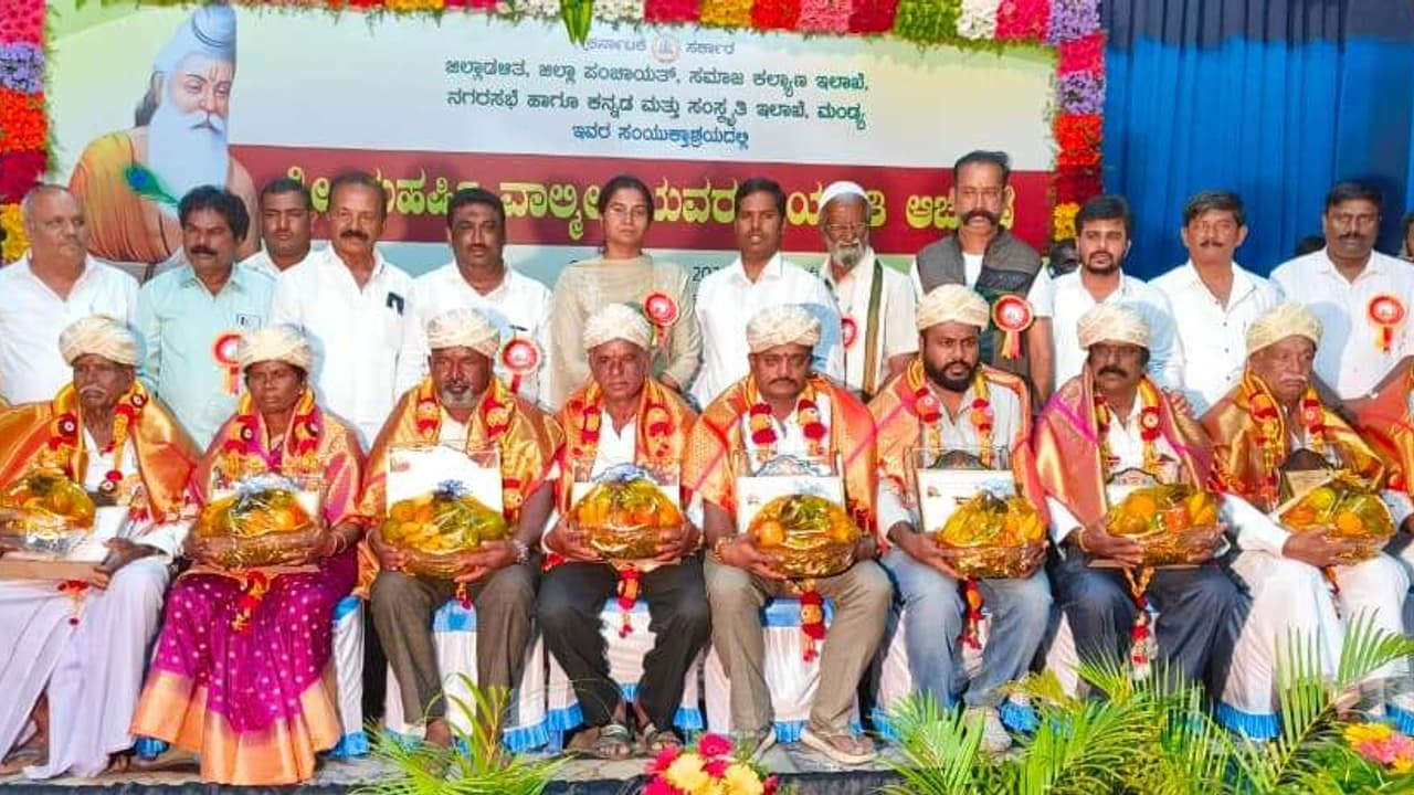 ಇದೇ ವೇಳೆ ಎಸ್ಸೆಸ್ಸೆಲ್ಸಿ ಪರೀಕ್ಷೆಯಲ್ಲಿ ಉತ್ತಮ ಅಂಕ ಗಳಿಸಿದ ವಿದ್ಯಾರ್ಥಿಗಳು, ವಿವಿಧ ಕ್ಷೇತ್ರಗಳಲ್ಲಿ ದುಡಿದ ಸಾಧಕರನ್ನು ಮತ್ತು ಅಥಿತಿ ಗಣ್ಯರನ್ನು ಸನ್ಮಾನಿಸಿ ಗೌರವಿಸಲಾಯಿತು. ಇದೇ ವೇಳೆ ನಗರಸಭೆ ಅಧ್ಯಕ್ಷ ಎಂ.ವಿ.ಪ್ರಕಾಶ್, ಉಪ ವಿಭಾಗಾಧಿಕಾರಿ ಶಿವಮೂರ್ತಿ, ಸಮಾಜ ಕಲ್ಯಾಣ ಇಲಾಖೆ ಉಪ ನಿರ್ದೇಶಕ ಕೆ.ಶ್ರೀನಿವಾಸ್, ನಗರಸಭೆ ಸದಸ್ಯರಾದ ಶ್ರೀಧರ್, ಹರೀಶ್, ಶಿವಲಿಂಗು, ಡಿ. ದೇವರಾಜು ಅರಸ್ ಹಿಂದುಳಿದ ವರ್ಗಗಳ ವೇದಿಕೆ ಅಧ್ಯಕ್ಷ ಸಂದೇಶ್, ಸಮುದಾಯ ಮುಖಂಡರಾದ ಚಂದ್ರನಾಯಕ್, ವೆಂಕಟೇಶ್ ನಾಯಕ್ ಹಲವರು ಇದ್ದರು.ಕಾರ್ಯಕ್ರಮಕ್ಕೂ ಮುನ್ನ ಜಿಲ್ಲಾಧಿಕಾರಿಗಳ ಕಚೇರಿ ಮುಂಭಾಗ ಶ್ರೀಮಹರ್ಷಿ ವಾಲ್ಮೀಕಿಯವರ ಪುತ್ತಳಿಗೆ ಪುಷ್ಪಾರ್ಚನೆ ಸಲ್ಲಿಸಿ, ಭವ್ಯ ರಥದೊಂದಿಗೆ ಡೊಳ್ಳು, ಕಂಸಾಳೆ, ಪೂಜೆ ಕುಣಿತ ಮತ್ತು ವೀರಗಾಸೆ ಮೂಲಕ ಕಲಾಮಂದಿರದವರೆಗೆ ಮೆರವಣಿಗೆ ಜರುಗಿತು. ಮೆರವಣಿಗೆಯಲ್ಲಿ ಜಿಪಂ ಸಿಇಒ ಕೆ.ಆರ್.ನಂದಿನಿ, ಜಿಲ್ಲಾ ಎಸ್ಪಿ ಮಲ್ಲಿಕಾರ್ಜುನ ಬಾಲದಂಡಿ, ಅಧಿಕಾರಿಗಳಾದ ಕೆ.ಶ್ರೀನಿವಾಸ್, ಕಾವ್ಯ ಸೇರಿದಂತೆ ವಿವಿಧ ಸಂಘ ಸಂಸ್ಥೆಗಳ ಪದಾಧಿಕಾರಿಗಳು, ಮುಖಂಡರು ಇದ್ದರು.7ಕೆಎಂಎನ್ ಡಿ20 ಮಂಡ್ಯ ಕಲಾಮಂದಿರದಲ್ಲಿ ನಡೆದ ಮಹರ್ಷಿ ವಾಲ್ಮೀಕಿ ಜಯಂತಿಯಲ್ಲಿ ವಿವಿಧ ಕ್ಷೇತ್ರಗಳಲ್ಲಿ ಸಾಧನೆ ಮಾಡಿದವರನ್ನು ಅಭಿನಂದಿಸಲಾಯಿತು.