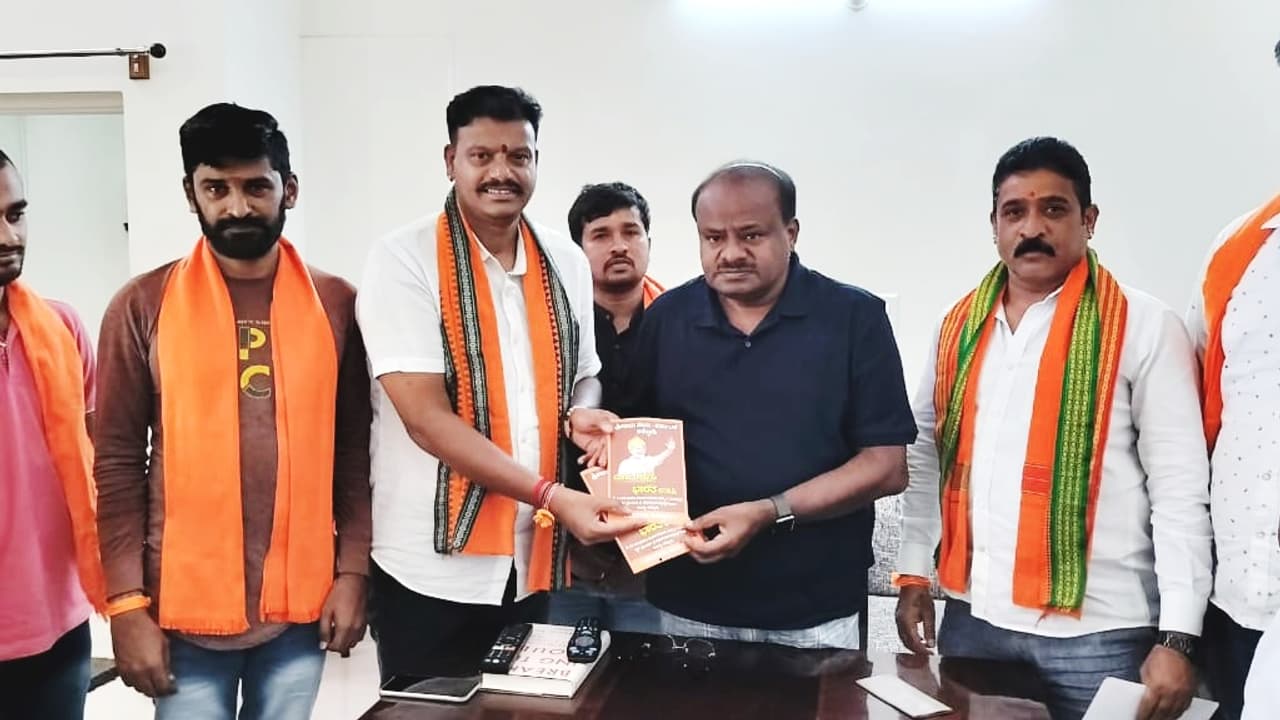 ಶ್ರೀರಾಮ ಸೇನಾ ಮುಖಂಡರು ಮಾಜಿ ಸಿಎಂ ಕುಮಾರಸ್ವಾಮಿ ಅವರಿಗೆ ಆಹ್ವಾನ ಪತ್ರಿಕೆ ನೀಡಿದರು.