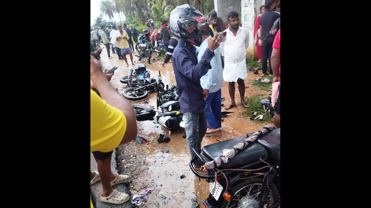 ಅರಸೀಕೆರೆ ತಾಲೂಕಿನ ಕೆಂಕೆರೆಹಳ್ಳಿ ಗೇಟ್ ಬಳಿ ಫಾರ್ಚುನರ್ ವಾಹನದ ನಿಯಂತ್ರಣ ತಪ್ಪಿ 17 ಬೈಕ್ಗಳ ಮೇಲೆ ಹತ್ತಿ ಬೈಕ್ಗಳು ಜಖಂ ಆಗಿರುವ ಘಟನೆ ನಡೆದಿದೆ. ತುಂಬಾ ಮಳೆ ಇದ್ದ ಕಾರಣ ಬೈಕ್ ಸವಾರರು ತಮ್ಮ ದ್ವಿಚಕ್ರ ವಾಹನಗಳನ್ನು ಕೆಂಕೆರೆಹಳ್ಳಿ ಗೇಟ್ ಸಮೀಪದ ಬಸ್ ನಿಲ್ದಾಣದ ಸಮೀಪ ನಿಲ್ಲಿಸಿ ಬಸ್ ನಿಲ್ದಾಣದ ಒಳಗೆ ನಿಂತಿದ್ದರು. ಈ ಸಂದರ್ಭದಲ್ಲಿ ಜಾವಗಲ್ ಮಾರ್ಗದಿಂದ ಬಾಣಾವರದ ಕಡೆಗೆ ಹೋಗುತ್ತಿದ್ದ ಫಾರ್ಚುನರ್ ವಾಹನವು ಚಾಲಕನ ನಿಯಂತ್ರಣ ತಪ್ಪಿ ಅಲ್ಲಿ ನಿಲ್ಲಿಸಿದ್ದ ಬೈಕ್ಗಳ ಮೇಲೆ ಹತ್ತಿದ ಪರಿಣಾಮ ಅಲ್ಲಿದ್ದಂತಹ 17 ಬೈಕುಗಳು ಜಖಂಗೊಂಡಿವೆ.