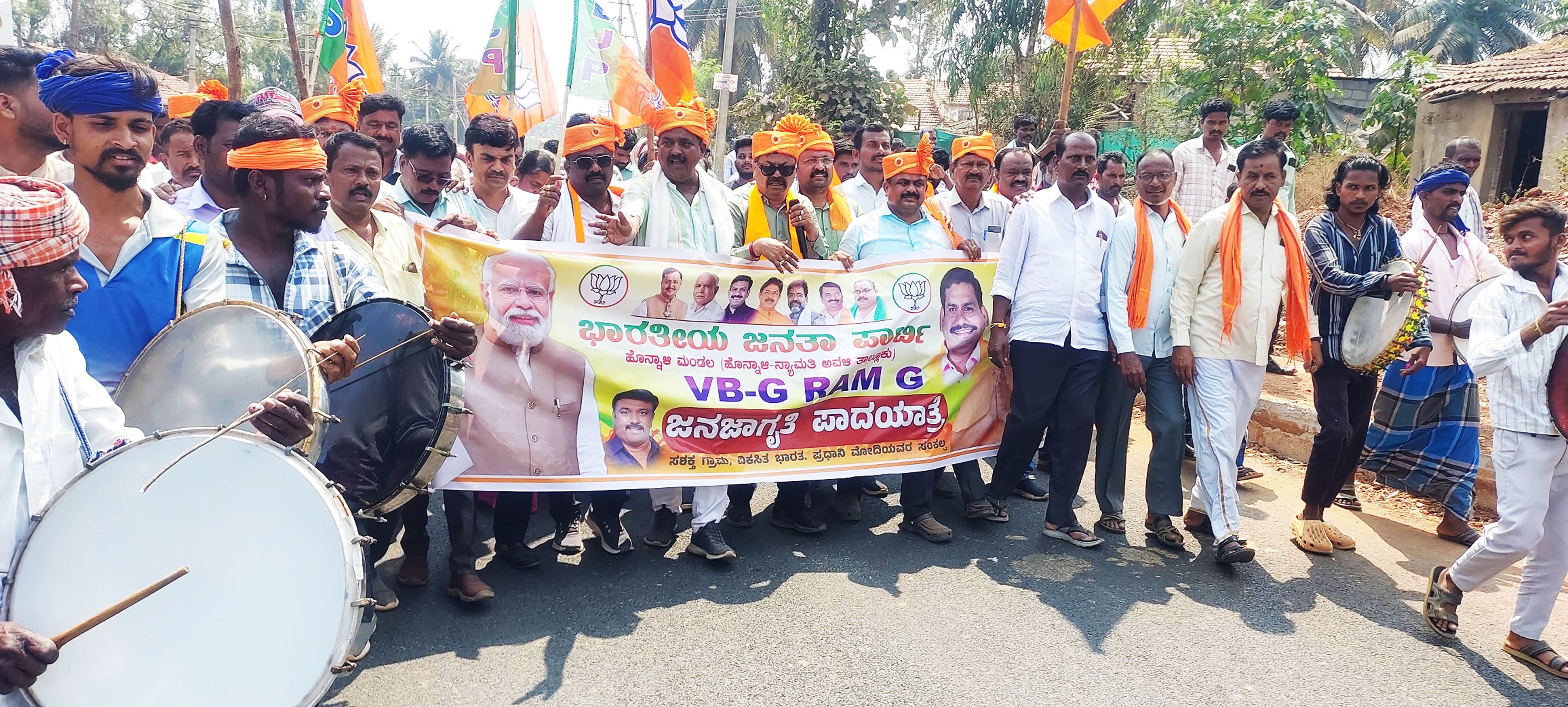 ಪ್ರಧಾನಿ ನರೇಂದ್ರ ಮೋದಿ ನೇತೃತ್ವದ ಕೇಂದ್ರ ಸರ್ಕಾರ ಜಾರಿಗೆ ತಂದಿರುವ ವಿಬಿ ಜಿ ರಾಮ್ ಜಿ ಜನೋಪಯೋಗಿ ಯೋಜನೆ ಬಗ್ಗೆ ಜನಜಾಗೃತಿ ಕಾರ್ಯಕ್ರಮಗಳನ್ನು ಕಳೆದೊಂದು ತಿಂಗಳ ಪರ್ಯಂತವಾಗಿ ತಾಲೂಕಿನಾದ್ಯಂತ 180ಕ್ಕೂ ಹೆಚ್ಚು ಜನಜಾಗೃತಿ ಕಾರ್ಯಕ್ರಮಗಳನ್ನು ನಡೆಸಲಾಗಿದೆ ಎಂದು ಮಾಜಿ ಸಚಿವ ಎಂ.ಪಿ.ರೇಣುಕಾಚಾರ್ಯ ಹೇಳಿದರು.ಮಂಗಳವಾರ ಹೊನ್ನಾಳಿ ಬಿಜೆಪಿ ಮಂಡಲ ವತಿಯಿಂದ ಹೊನ್ನಾಳಿ ಪಟ್ಟಣದಿಂದ ಸಂಗೊಳ್ಳಿ ರಾಯಣ್ಣ ಪ್ರತಿಮೆಗೆ ಮಾಲಾರ್ಪಣೆ ಮಾಡಿ, ಕೊನಾಯ್ಕನಹಳ್ಳಿ, ಬಳ್ಳೇಶ್ವರ, ಹನುಮಸಾಗರವರೆಗೆ ಸುಮಾರು ಎಂಟೂವರೆ ಕಿ.ಮೀ. ಪಾದಯಾತ್ರೆ ನಡೆಸಿ, ಬಳಿಕ ಹನುಮಸಾಗರ ಗ್ರಾಮದಲ್ಲಿ ನಡೆದ ಜನಜಾಗೃತಿ ಕಾರ್ಯಕ್ರಮದಲ್ಲಿ ಮಾತನಾಡಿದರು.