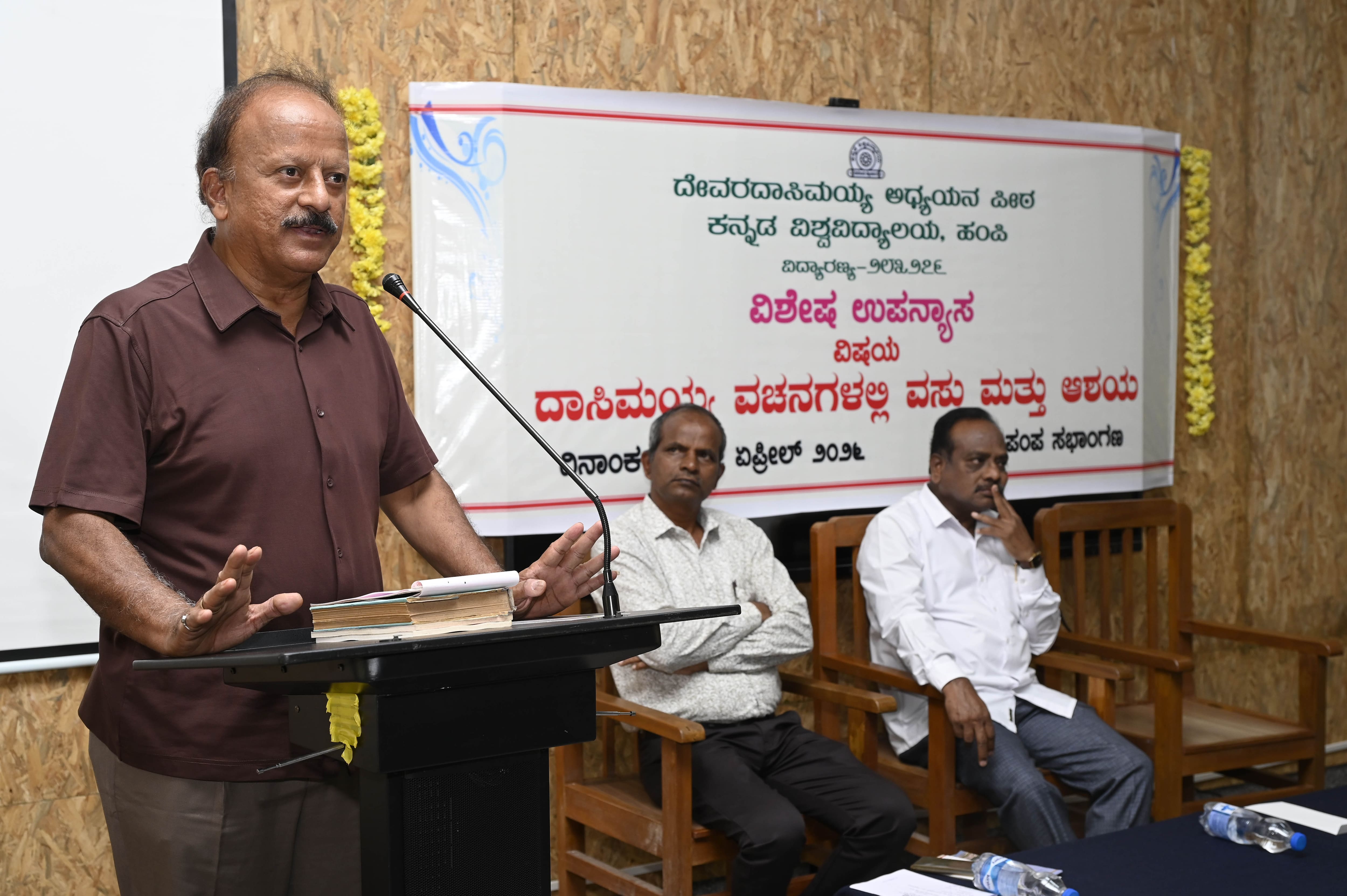 ಹಂಪಿ ಕನ್ನಡ ವಿಶ್ವವಿದ್ಯಾಲಯದ ಪಂಪ ಸಭಾಂಗಣದಲ್ಲಿ ಮಂಗಳವಾರ ದೇವರದಾಸಿಮಯ್ಯ ಅಧ್ಯಯನ ಪೀಠದಿಂದ ಆಯೋಜಿಸಲಾಗಿದ್ದ ದಾಸಿಮಯ್ಯ ವಚನಗಳಲ್ಲಿ ವಸ್ತು ಮತ್ತು ಆಶಯ ಎಂಬ ವಿಷಯ ಕುರಿತು ಉಪನ್ಯಾಸದಲ್ಲಿ ಮಾತನಾಡಿದರು.ಹಂಪಿ ಕನ್ನಡ ವಿಶ್ವವಿದ್ಯಾಲಯದ ಕುಲಪತಿ ಡಾ. ಡಿ.ವಿ. ಪರಮಶಿವಮೂರ್ತಿ ಅವರು ಸಮಾರಂಭದ ಅಧ್ಯಕ್ಷೆವಹಿಸಿ ಮಾತನಾಡಿ, ದೇವರ ದಾಸಿಮಯ್ಯ ಕುರಿತು ಮೂಲಭೂತ ಸಂಶೋಧನೆ ಅಗತ್ಯವಿದೆ. ಜೀವನದ ಮೇಲೆ ಪ್ರೀತಿ ಹೊಂದಿದವರೇ ವಚನಕಾರರು ಎಂದು ಹೇಳುತ್ತ ದಾಸಿಮಯ್ಯನವರ ವಚನಗಳಲ್ಲಿ ಕಾಣುವ ಸಂಸಾರಿಕ ಅಂಶಗಳನ್ನು ಅವರು ವಿವರಿಸಿದರು.
