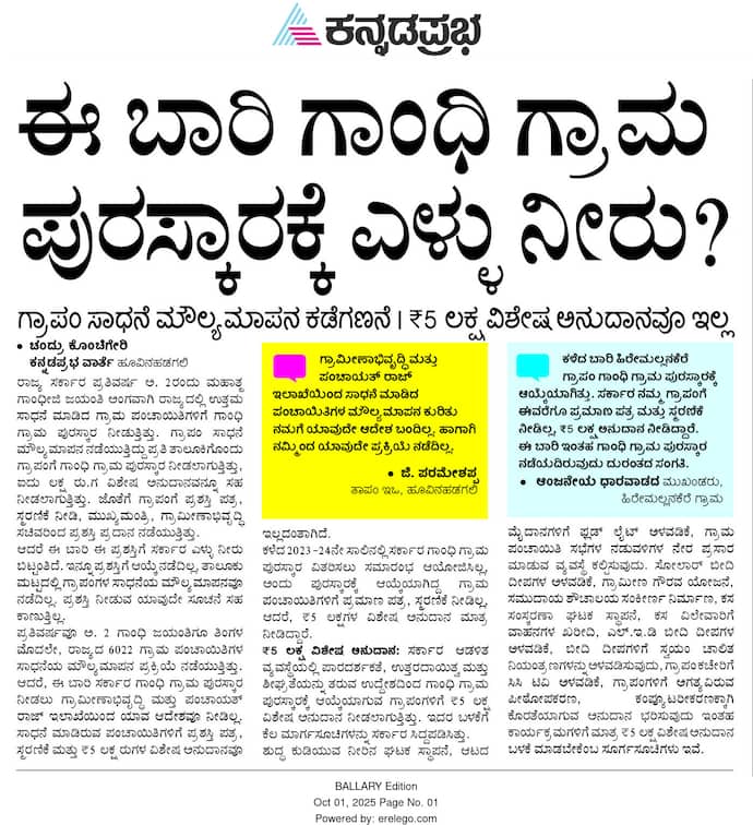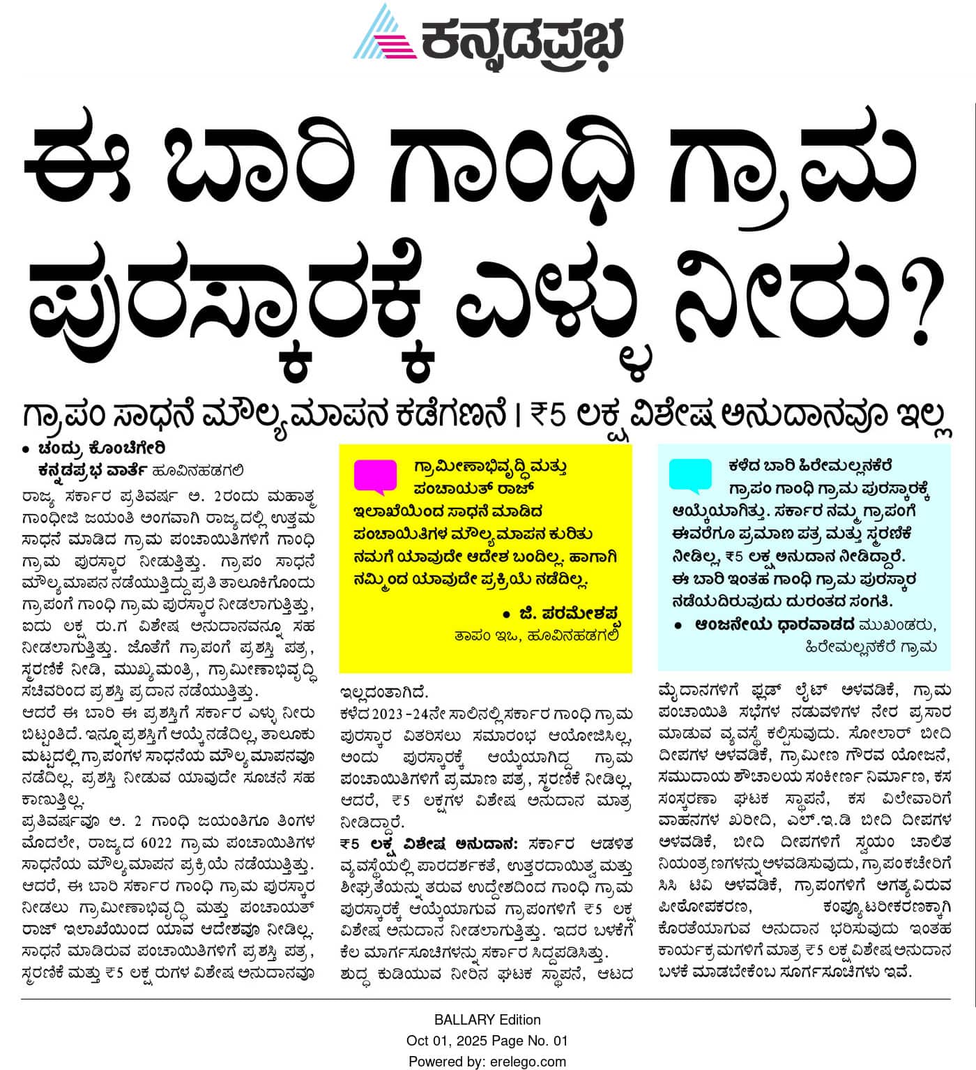 ಹೂವಿನಹಡಗಲಿ: 2024-25ನೇ ಸಾಲಿನ ಗಾಂಧಿ ಗ್ರಾಮ ಪುರಸ್ಕಾರವನ್ನು ನೀಡಲು ಸರ್ಕಾರ ಕೊನೆಗೂ ಮುಂದಾಗಿದೆ. ಈ ಬಾರಿ ಸರ್ಕಾರ ಮೂರು ಹಂತದಲ್ಲಿ ಉತ್ತಮ ಕೆಲಸ ಹಾಗೂ ವಿಶೇಷ ಸಾಧನೆಗೈದ ಗ್ರಾಮ ಪಂಚಾಯಿತಿಗಳನ್ನು ಆಯ್ಕೆ ಮಾಡಿ ಪುರಸ್ಕಾರ ನೀಡಲು ನಿರ್ಧರಿಸಿದೆ.ಪ್ರತಿ ಬಾರಿ ಸರ್ಕಾರ ಅಕ್ಟೋಬರ್ 2ರ ಮಹಾತ್ಮ ಗಾಂಧೀಜಿ ಜಯಂತಿ ಅಂಗವಾಗಿ ರಾಜ್ಯದಲ್ಲಿ ಅತ್ಯುತ್ತಮ ಸಾಧನೆ ಮಾಡಿದ ಗ್ರಾಮ ಪಂಚಾಯಿತಿಯನ್ನು ಆಯ್ಕೆ ಮಾಡಿ, ಪುರಸ್ಕಾರ ಮತ್ತು ಪ್ರೋತ್ಸಾಹ ಧನ ನೀಡಲಾಗುತ್ತಿತ್ತು. ಈ ಬಾರಿ ಸರ್ಕಾರ ವಿಳಂಬವಾದರೂ ಕೊನೆಗೂ ನಿರ್ಧಾರ ಕೈಗೊಂಡಿದೆ. ಈ ಕುರಿತು ಕನ್ನಡಪ್ರಭ ಅ.1ರಂದು ಈ ಬಾರಿ ಗಾಂಧಿ ಗ್ರಾಮ ಪುರಸ್ಕಾರಕ್ಕೆ ಎಳ್ಳು ನೀರು? ಎಂಬ ಶೀರ್ಷಿಕೆಯಡಿ ವಿಶೇಷ ವರದಿ ಪ್ರಕಟಿಸಿತ್ತು.