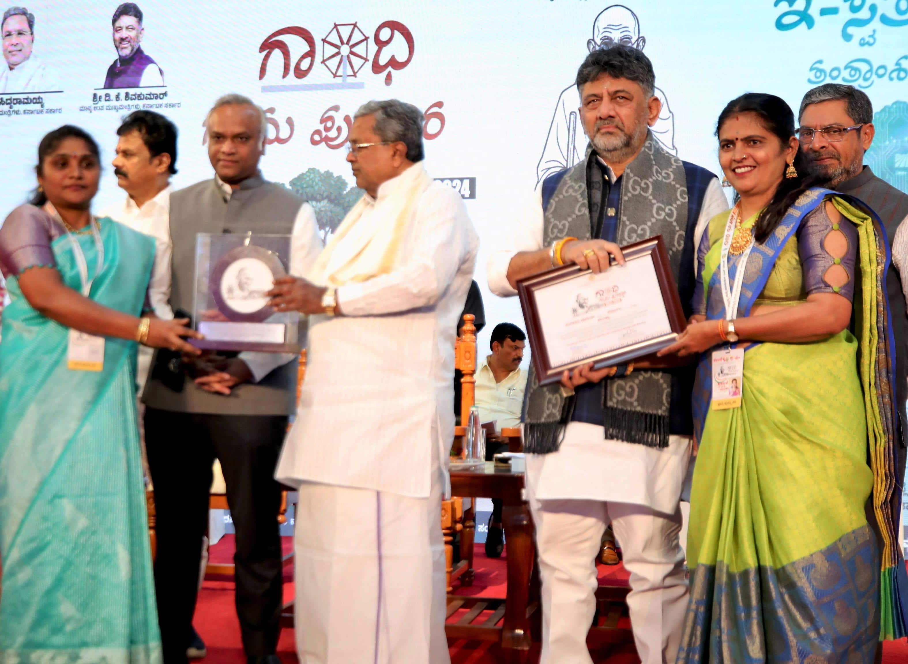 ಕಳಲುಘಟ್ಟ ಗ್ರಾಪಂ ಪಿಡಿಒ ಗೀತಾಮಣಿ, ಅಧ್ಯಕ್ಷೆ ಮಮತಾ ಅವರಿಗೆ ಸಿಎಂ ಸಿದ್ದರಾಮಯ್ಯ ಹಾಗೂ ಡಿಸಿಎಂ ಡಿ.ಕೆ.ಶಿವಕುಮಾರ್, ಸಚಿವ ಪ್ರಿಯಾಂಕ್ ಖರ್ಗೆ, ಶಾಸಕ ಶ್ರೀನಿವಾಸ್ ಗಾಂಧಿ ಗ್ರಾಮ ಪುರಸ್ಕಾರ, ಸ್ಮರಣಿಕೆ ಹಾಗೂ ಪ್ರೋತ್ಸಾಹಧನ ನೀಡಿ ಗೌರವಿಸಿದರು.