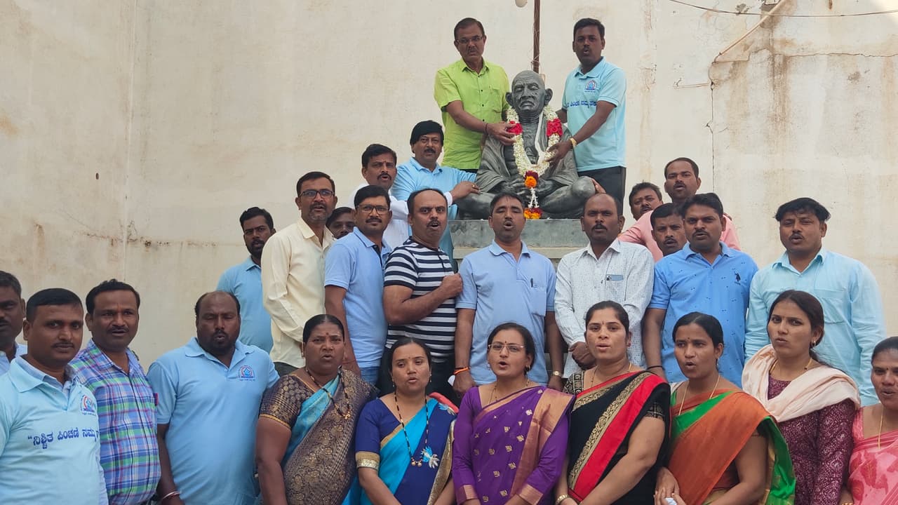 ತಾಲೂಕು ಸರ್ಕಾರಿ ನೌಕರರು ನೂತನ ರಾಷ್ಟ್ರೀಯ ಪಿಂಚಣಿ ಯೋಜನೆಯನ್ನು ರದ್ದುಗೊಳಿಸಿ ಹಳೆ ಪಿಂಚಣಿ ಯೋಜನೆ ಜಾರಿಗೊಳಿಸುವಂತೆ ಆಗ್ರಹಿಸಿ ಪಟ್ಟಣದ ಸೋಮೇಶ್ವರ ಪಾದಗಟ್ಟಿಯ ಹತ್ತಿರದ ಇರುವ ಮಹಾತ್ಮಾ ಗಾಂಧೀಜಿ ಪ್ರತಿಮೆಗೆ ಮಾಲಾರ್ಪಣೆ ಮಾಡಿ ಶಾಸಕ ಡಾ. ಚಂದ್ರು ಲಮಾಣಿ ಅವರಿಗೆ ಮನವಿ ಪತ್ರ ಸಲ್ಲಿಸಲಾಯಿತು.