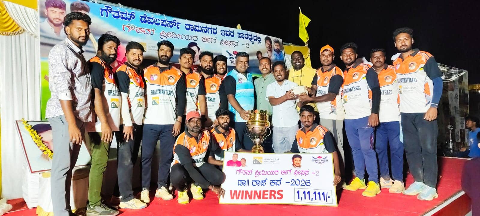 16ಕೆಆರ್ ಎಂಎನ್ 5.ಜೆಪಿಜಿರಾಮನಗರದ ಜಿಲ್ಲಾ ಕ್ರೀಡಾಂಗಣದಲ್ಲಿ ನಡೆದ ಗೌತಮ್ ಪ್ರೀಮಿಯರ ಲೀಗ್ ಸೀಸನ್-2ರ ಡಾ.ರಾಜ್ ಕಪ್ 2026 ಪಂದ್ಯಾವಳಿಯಲ್ಲಿ ಚಾಂಪಿಯನ್ ಆದ ಭಾಗ್ಯವಂತರು ತಂಡಕ್ಕೆ ಟ್ರೋಫಿ ವಿತರಿಸಲಾಯಿತು.