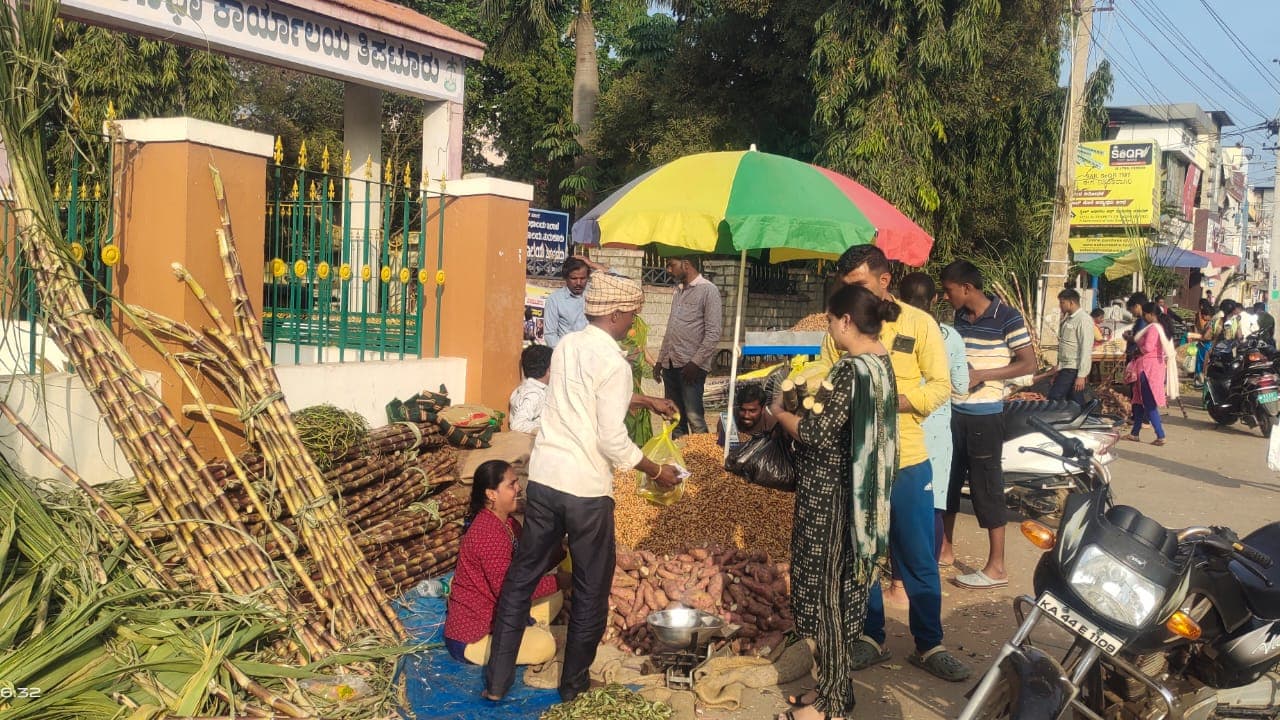 ನಗರದ ಪ್ರವಾಸಿ ಮಂದಿರದ ವೃತ್ತದಿಂದ ಅರಳೀಕಟ್ಟೆ ವೃತ್ತ ಸೇರಿದಂತೆ ರೈಲ್ವೆ ಸ್ಟೇಷನ್ ರಸ್ತೆ, ತರಕಾರಿ ಮಾರುಕಟ್ಟೆ, ಬಿ.ಎಚ್.ರಸ್ತೆಯ ಅಕ್ಕಪಕ್ಕದ ರಸ್ತೆಗಳಲ್ಲಿ ಹಬ್ಬಕ್ಕೆ ಬೇಕಾದ ಎಳ್ಳು-ಬೆಲ್ಲ, ಅವರೇಕಾಯಿ, ಕಡಲೆಕಾಯಿ, ಕಬ್ಬು, ಗೆಣಸು ಮತ್ತಿತರ ತರೇಹವಾರಿ ವಸ್ತುಗಳನ್ನು ವ್ಯಾಪಾರಸ್ಥರು ರಾಶಿ ಹಾಕಿಕೊಂಡಿದ್ದರು.