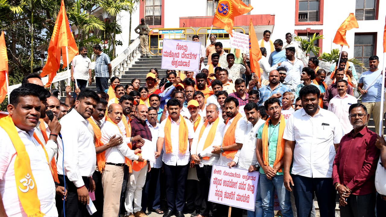 ಶಿವಮೊಗ್ಗ: ಚಾಮರಾಜಪೇಟೆಯಲ್ಲಿ ಗೋವುಗಳ ಕೆಚ್ಚಲನ್ನು ಕತ್ತರಿಸಿದ ದುಷ್ಕರ್ಮಿಗಳಿಗೆ ಕಠಿಣ ಶಿಕ್ಷೆ ವಿಧಿಸಬೇಕೆಂದು ಆಗ್ರಹಿಸಿ ಬಿಜೆಪಿ ಮುಖಂಡರು, ಶಿವಮೊಗ್ಗದ ಗೋ ರಕ್ಷಾ ಪರಿವಾರದ ಕಾರ್ಯಕರ್ತರು ಶುಕ್ರವಾರ ಜಿಲ್ಲಾಧಿಕಾರಿ ಕಚೇರಿ ಎದುರು ಪ್ರತಿಭಟನೆ ನಡೆಸಿದರು.