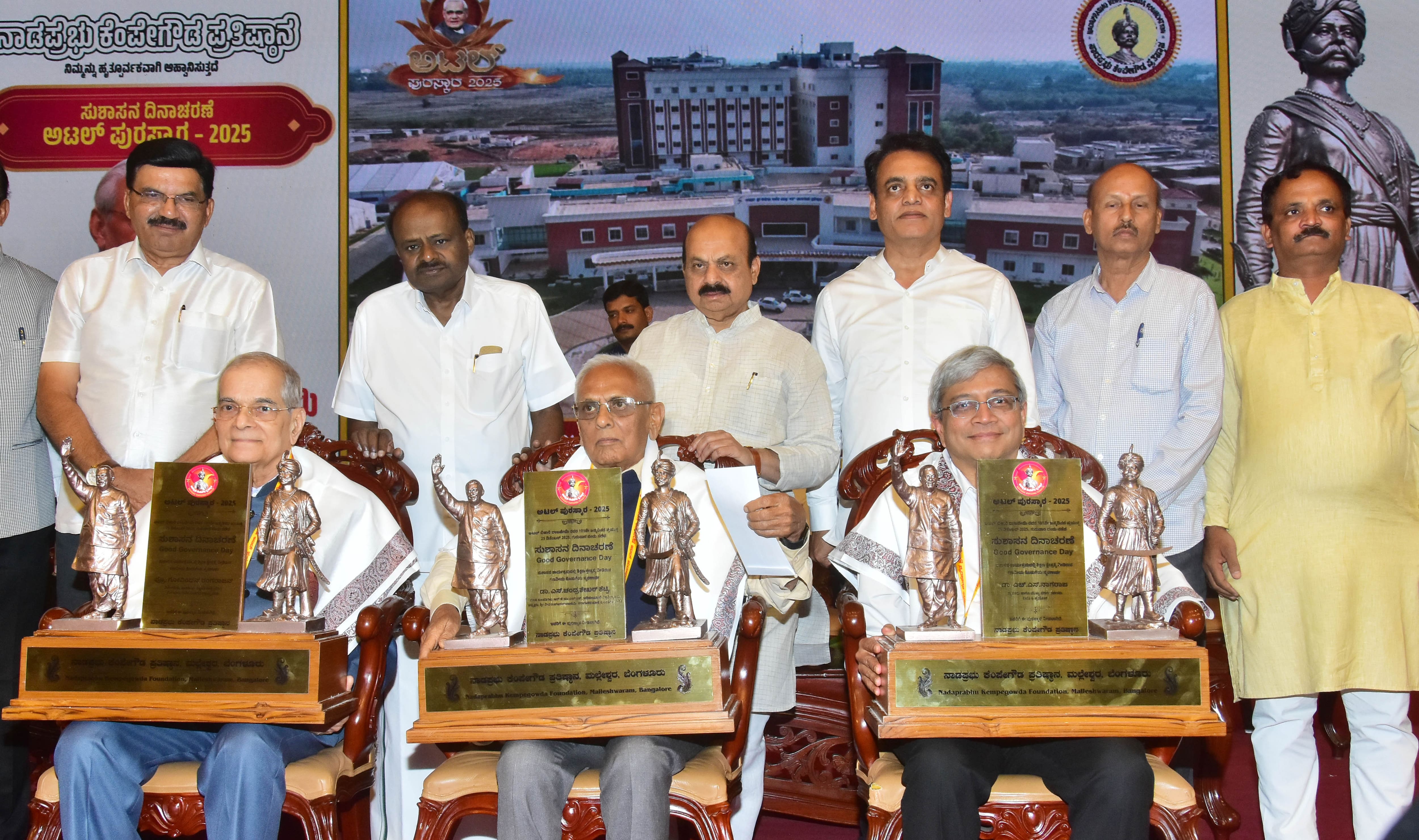 ಮೂವರಿಗೆ ಅಟಲ್ ಪುರಸ್ಕಾರ ಪ್ರದಾನಭಾರತೀಯ ವಿಜ್ಞಾನ ಸಂಸ್ಥೆ ನಿರ್ದೇಶಕ ಪ್ರೊ.ಗೋವಿಂದನ್ ರಂಗರಾಜನ್, ರಾಜೀವ್ ಗಾಂಧಿ ವಿಶ್ವವಿದ್ಯಾಲಯ (ಆರ್ಜೆಯುಎಚ್ಎಸ್) ಮಾಜಿ ಕುಲಪತಿ ಡಾ.ಎಸ್.ಚಂದ್ರಶೇಖರ್ ಶೆಟ್ಟಿ ಮತ್ತು ಬಿಎಎಸ್ಇ (ಬೇಸ್) ಮತ್ತು ಪ್ರಯೋಗ ಸಂಸ್ಥೆ ಸ್ಥಾಪಕರಾದ ಡಾ.ಎಚ್.ಎಸ್.ನಾಗರಾಜ ಅವರಿಗೆ 2025 ನೇ ಸಾಲಿನ ಅಟಲ್ ಪುರಸ್ಕಾರ ನೀಡಿ ಗೌರವಿಸಲಾಯಿತು.