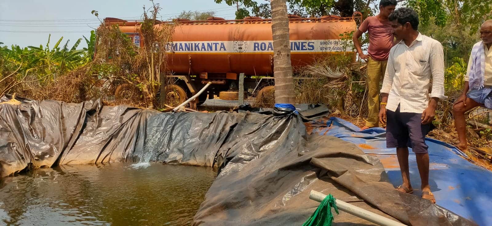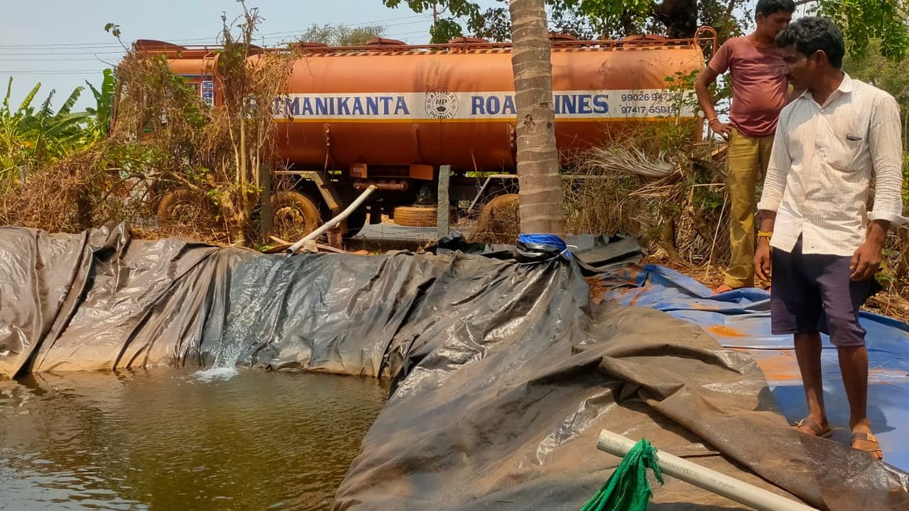 -7ಕೆಸಿಎನ್ಜಿ1: ಟ್ಯಾಂಕರ್ ಮೂಲಕ ಕೃಷಿ ಹೊಂಡಕ್ಕೆ ನೀರು ಹರಿಸುತ್ತೀರುವುದು.
