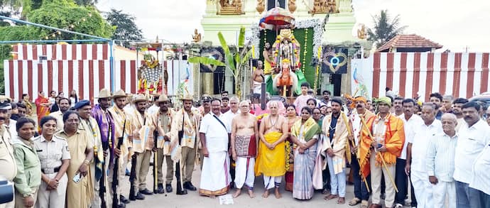 ಕನ್ನಡಪ್ರಭ ವಾರ್ತೆ ಎಚ್.ಡಿ. ಕೋಟೆ ಪಟ್ಟಣದ ವರದರಾಜ ದೇವಾಲಯದ ಆವರಣದಲ್ಲಿ ವಿಜಯದಶಮಿಯ ಪ್ರಯುಕ್ತ ವರದರಾಜಸ್ವಾಮಿಗೆ ಪೊಲೀಸ್ ಇಲಾಖೆಯಿಂದ ಗೌರವ ವಂದನೆ ಸಲ್ಲಿಸಲಾಯಿತು.ವರದರಾಜಸ್ವಾಮಿ ದೇವಾಲಯದ ಪ್ರಧಾನ ಅರ್ಚಕ ತಿರುಮಲಾಚಾರ್ ಮಾತನಾಡಿ, ಮೈಸೂರು ಸಂಸ್ಥಾನದಲ್ಲಿ ಅನಾದಿ ಕಾಲದಿಂದಲೂ ದಸರಾ ನಡೆಯುತ್ತಿದೆ. ಚಾಮುಂಡೇಶ್ವರಿಗೆ ಪೊಲೀಸ್ ವಂದನೆ ಮಾಡುತ್ತಾ ಬರಲಾಗಿದೆ. ಮೈಸೂರಿನಲ್ಲಿ ಚಾಮುಂಡೇಶ್ವರಿ ದೇವಿಗೆ ಬಿಟ್ಟರೆ ಪಟ್ಟಣದ ವರದರಾಜಸ್ವಾಮಿಗೆ ಪೊಲೀಸ್ ವಂದನೆ ನಡೆಯುತ್ತದೆ, ಅದರಂತೆ ಗುರುವಾರ ವರದರಾಜಸ್ವಾಮಿಗೆ ಪೊಲೀಸ್ ವಂದನೆ ನಡೆದಿದೆ. ಇದನ್ನು ಪೊಲೀಸ್ ಪೂಜೆ ಎಂದೇ ಹಮ್ಮಿಕೊಂಡು ನಡೆಸಲಾಗುತ್ತಿದೆ ಎಂದರು.ಎಚ್.ಡಿ. ಕೋಟೆ ದಸರಾ ಆರಂಭ ದಿನದಿಂದ ಇಲ್ಲಿಯವರೆಗೂ ಪೊಲೀಸ್ ಪೂಜೆ ನಿರಂತರವಾಗಿ ನಡೆದುಕೊಂಡು ಬರುತ್ತಿರುವುದು ಇಲ್ಲಿನ ವಿಶೇಷ ಎಂದರು.ವರದರಾಜಸ್ವಾಮಿ ದೇವಾಲಯದಲ್ಲಿ ವಿಗ್ರಹ ಕಳುವಾಗಿದ್ದಾಗ ವಿಗ್ರಹ ಸಿಗುವವರೆಗೆ ಅಂದರೆ ಐದು ವರ್ಷಗಳ ಕಾಲ ದಸರಾ ನಡೆದಿರಲಿಲ್ಲ, ಆಗ ಹೊರತುಪಡಿಸಿ ಉಳಿದೆಲ್ಲ ದಸರಾಗಳಲ್ಲಿ ಪೊಲೀಸ್ ಪೂಜೆ ಯಶಸ್ವಿಯಾಗಿ ನಡೆಯುತ್ತಾ ಬಂದಿದೆ ಎಂದರು.ಪೊಲೀಸ್ ಪೂಜೆ ನಂತರ ಸಿಪಿಐ ಗಂಗಾಧರ್ ಮಾತನಾಡಿ, ರಾಜ್ಯದಲ್ಲಿ ದಸರಾ ವೇಳೆ ಮೈಸೂರಿನಲ್ಕಿ ಚಾಮುಂಡೇಶ್ವರಿ ಬಳಿಕ ವರಸರಾಜಸ್ವಾಮಿಗೆ ಪೊಲೀಸ್ ವಂದನೆ ಸಲ್ಲಿಸಲಾಗುತ್ತಿದೆ. ನಮ್ಮ ತಾಲೂಕು ಕೇಂದ್ರದಲ್ಲಿ ನಡೆಯುತ್ತಿರುವುದು ಸಂತಸದ ವಿಚಾರ, ನಮ್ಮ ಸಿಬ್ಬಂದಿಗಳು ಈ ಪೂಜಾ ಕಾರ್ಯಕ್ರಮಕ್ಕೆ ಉತ್ಸುಕತೆ ಭಾಗವಹಿಸಿ ಕೋಟೆ ದಸರಾವನ್ನು ಯಶಸ್ವಿಗೊಳಿಸಿದ್ದಾರೆ ಎಂದರು.ಕಳೆದ ಒಂಬತ್ತು ದಿನಗಳಿಂದ ಪಟ್ಟಣದಲ್ಲಿ ದಸರಾ ಮಾದರಿಯಲ್ಲೇ ಅನೇಕ ಉತ್ಸವಗಳು, ಸಾಂಸ್ಕೃತಿಕ ಕಾರ್ಯಕ್ರಮಗಳು, ವಿಶೇಷ ಪೂಜಾ ಕೈಂಕರ್ಯಗಳು, ಹೋಮಗಳು ನಡೆದವು, ಮುಂದಿನ ನಾಲ್ಕು ದಿನಗಳ ಕಾಲವು ಸಹ ಅನೇಕ ಪೂಜಾ ಕಾರ್ಯಕ್ರಮಗಳು ಜರುಗಲಿವೆ ಎಂದು ದೇವಾಲಯ ದಸರಾ ಆಚರಣಾ ಸಮಿತಿ ಅಧ್ಯಕ್ಷ ಶ್ರೀಕಾಂತ್ ತಿಳಿಸಿದರು.ಪೊಲೀಸ್ ವಂದನೆಯನ್ನು ಎಸ್ಐ ಸುರೇಶ್ ನಾಯಕ, ಚಿಕ್ಕನಾಯಕ, ಎಎಸ್ಐ ಶಿವಕುಮಾರ್, ಲೀಲಾವತಿ, ಸಿಬ್ಬಂದಿ ಸಲ್ಲಿಸಿದರು.ಆಗಮಿಕರಾದ ರಾಮಪ್ರಿಯ, ಶ್ರೀನಿಧಿ, ಪುರಸಭಾ ಅಧ್ಯಕ್ಷ ಶಿವಮ್ಮ ಚಾಕಳ್ಳಿ ಕೃಷ್ಷ, ಮುಖಂಡರಾದ ಎಂ.ಸಿ. ದೊಡ್ಡ ನಾಯಕ, ನಾಗರಾಜು, ಪ್ರಸಾದ್, ವೈ.ಟಿ. ಮಹೇಶ್, ಶ್ರೀಕಾಂತ್, ಜಯಂತ್, ದೇವರಾಜು, ಸ್ವಾಮಿನಾಯಕ, ದೇವನಾಯಕ, ಚಿಕ್ಕನಾಯಕ, ಕೆಂಡಗಣ್ಣಸ್ವಾಮಿ, ರಾಜೇಂದ್ರ, ವೆಂಕಟೇಶ್, ಸತೀಶ್, ಮಂಜು, ಮನು, ಸಂತೋಷ್, ವೆಂಕಟೇಶ್, ನಿಂಗರಾಜು ಇದ್ದರು.