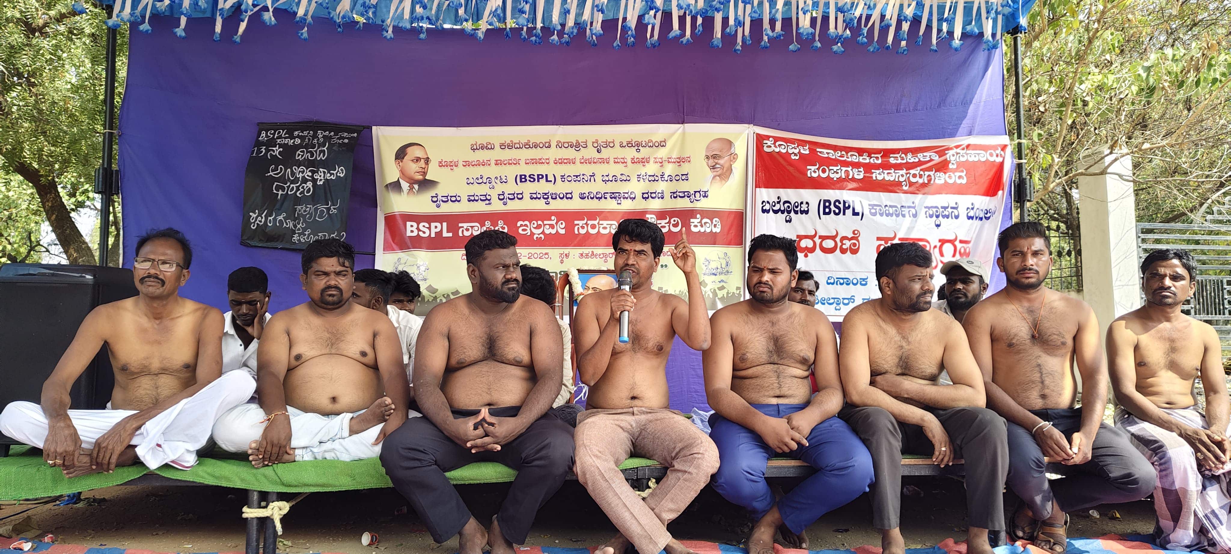 ಅನಿರ್ಧಿಷ್ಠಾವಧಿ ಧರಣಿ ಸತ್ಯಾಗ್ರಹದ ೧೩ನೇ ದಿನವಾದ ಬುಧವಾರ ಒಕ್ಕೂಟದ ಕಾರ್ಯಕರ್ತರು ಅರೆಬೆತ್ತಲೆ ಧರಣಿ ಸತ್ಯಾಗ್ರಹ ನಡೆಸುವ ಮೂಲಕ ಉದ್ದೇಶಿತ ಬಿಎಸ್ಪಿಎಲ್ಕಾರ್ಖಾನೆ ಸ್ಥಾಪಿಸಿ ಇಲ್ಲವೆ ಸರ್ಕಾರಿ ನೌಕರಿ ಕೊಡಿ ಎಂದು ಘೋಷಣೆ ಹಾಕಿ ಆಕ್ರೋಶ ವ್ಯಕ್ತಪಡಿಸಿದರು.ಅರೆಬೆತ್ತಲೆ ಧರಣಿ ಸತ್ಯಾಗ್ರಹದಲ್ಲಿ ಮಾತನಾಡಿದ ಒಕ್ಕೂಟದ ಹನುಮಂತಪ್ಪ ಕೌದಿ, ಕೊಪ್ಪಳ, ಹಾಲವರ್ತಿ, ಕಿಡದಾಳ ಹಾಗೂ ಸುತ್ತಮುತ್ತಲ ಗ್ರಾಮದ ರೈತರು ಕಾರ್ಖಾನೆಗೆ ಭೂಮಿ ನೀಡಿದ್ದಾರೆ. ಕಾರ್ಖಾನೆ ಸ್ಥಾಪನೆಯಾದರೆ ಉದ್ಯೋಗಗಳು ಸೃಷ್ಠಿಯಾಗುತ್ತವೆ. ಭೂಮಿ ಕಳೆದುಕೊಂಡ ರೈತರ ಕುಟುಂಬಕ್ಕೆ ಉದ್ಯೋಗ ಸಿಗುತ್ತವೆ ಎಂಬ ಆಶಯದೊಂದಿಗೆ ಕಾರ್ಖಾನೆಗೆ ಭೂಮಿ ನೀಡಿದ್ದಾರೆ. ಈಗ ಬಿಎಸ್ಪಿಎಲ್ ಕೈಗಾರಿಕೆ ಸ್ಥಾಪನೆ ಮಾಡಲು ಮುಂದಾಗಿದ್ದು ಇದಕ್ಕೆ ಹಲವು ರೀತಿಯಲ್ಲಿ ವಿರೋಧ ವ್ಯಕ್ತವಾಗುತ್ತಿದೆ. ಆದರೆ ಕಾರ್ಖಾನೆಗೆ ಭೂಮಿ ಕಳೆದುಕೊಂಡು ಅತಂತ್ರ ಸ್ಥಿತಿಯಲ್ಲಿರುವ ರೈತರ ಕುಟುಂಬಗಳ ಪರಸ್ಥಿತಿ ಏನು? ಎಂದು ಆಕ್ರೋಶ ವ್ಯಕ್ತಪಡಿಸಿದರು.