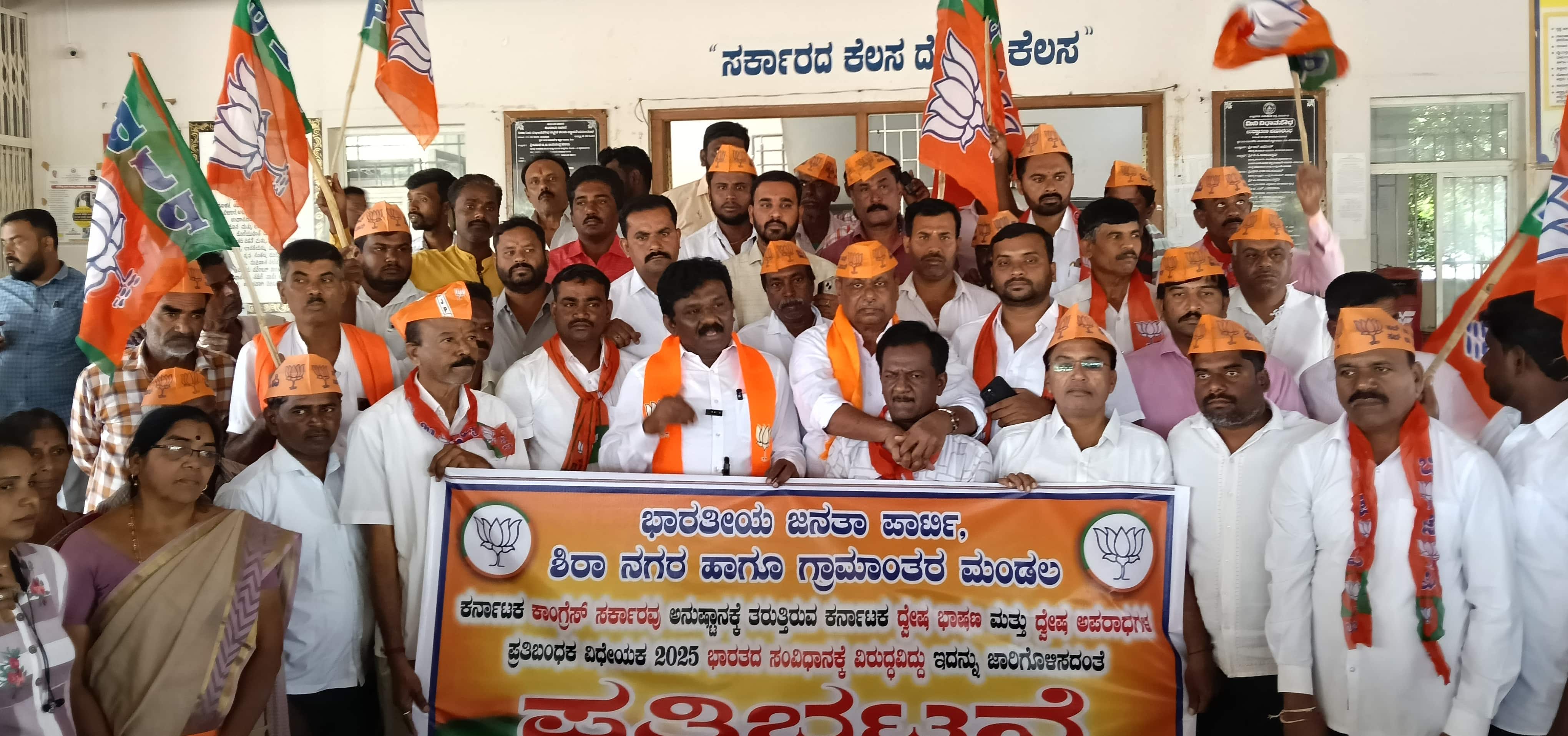 ಕರ್ನಾಟಕ ಸರಕಾರವು ಅನುಷ್ಠಾನಕ್ಕೆ ತರುತ್ತಿರುವ ಕರ್ನಾಟಕ ದ್ವೇಷ ಭಾಷಣ ಮತ್ತು ದ್ವೇಷ ಅಪರಾಧಗಳ ಪ್ರತಿಬಂಧಕ ವಿಧೇಯಕ ೨೦೨೫ ಭಾರತದ ಸಂವಿಧಾನಕ್ಕೆ ವಿರುದ್ಧವಾಗಿದೆ. ಸಂವಿಧಾನದಡಿ ನೀಡಿದ್ದ ಅಭಿವ್ಯಕ್ತಿ ಸ್ವಾತಂತ್ರ್ಯವನ್ನು ಕಾಂಗ್ರೆಸ್ ಸರಕಾರ ಕಿತ್ತುಕೊಳ್ಳುತ್ತಿದೆ ಎಂದು ವಿಧಾನಪರಿಷತ್ ಸದಸ್ಯ ಚಿದಾನಂದ್ ಎಂ.ಗೌಡ ಆರೋಪಿಸಿದರು.ಅವರು ಬುಧವಾರ ಶಿರಾ ನಗರ ಹಾಗೂ ಗ್ರಾಮಾಂತರ ಬಿಜೆಪಿ ವತಿಯಿಂದ ನಗರದ ಮಿನಿ ವಿಧಾನಸೌಧದ ಬಳಿ ಹಮ್ಮಿಕೊಂಡಿದ್ದ ಪ್ರತಿಭಟನೆಯಲ್ಲಿ ಭಾಗವಹಿಸಿ ಮಾತನಾಡಿದರು. ಕರ್ನಾಟಕ ದ್ವೇಷ ಭಾಷಣ ಮತ್ತು ದ್ವೇಷ ಅಪರಾಧಗಳ ಪ್ರತಿಬಂಧಕ ವಿಧೇಯಕ ೨೦೨೫ ನಾಗರೀಕರ ಮೂಲ ಹಕ್ಕುಗಳನ್ನು ಕಸಿದುಕೊಳ್ಳುತ್ತದೆ. ಇದು, ಸರಕಾರದ ವಿರುದ್ಧ ಮಾತನಾಡುವವರ ಬಾಯಿ ಮುಚ್ಚಿಸುವ ಸಾಧನವಾಗಿದೆ. ಇದರಡಿ ದ್ವೇಷ ಭಾಷಣಕ್ಕೆ ನೀಡಿರುವ ವ್ಯಾಖ್ಯಾನವೇ ಅಸ್ಪಷ್ಟವಾಗಿದೆ. ಸರಕಾರದ ನೀತಿಗಳ ವಿರುದ್ಧ ಟೀಕೆ, ಸಾಮಾಜಿಕ ಚರ್ಚೆ, ವ್ಯಂಗ್ಯ ಮಾಡುವುದು ಅಥವಾ ಸತ್ಯವನ್ನು ಹೇಳುವುದನ್ನೂ ಕೂಡ ದ್ವೇಷ ಎಂದು ಪರಿಗಣಿಸುವ ಅಪಾಯವಿದೆ. ಆದ್ದರಿಂದ ಸರಕಾರ ದ್ವೇಷ ಭಾಷಣ ಮತ್ತು ದ್ವೇಷ ಅಪರಾಧಗಳ ಪ್ರತಿಬಂಧಕ ವಿಧೇಯಕ ೨೦೨೫ ಜಾರಿ ಮಾಡಬಾರದು ಎಂದು ಒತ್ತಾಯಿಸಿದರು.