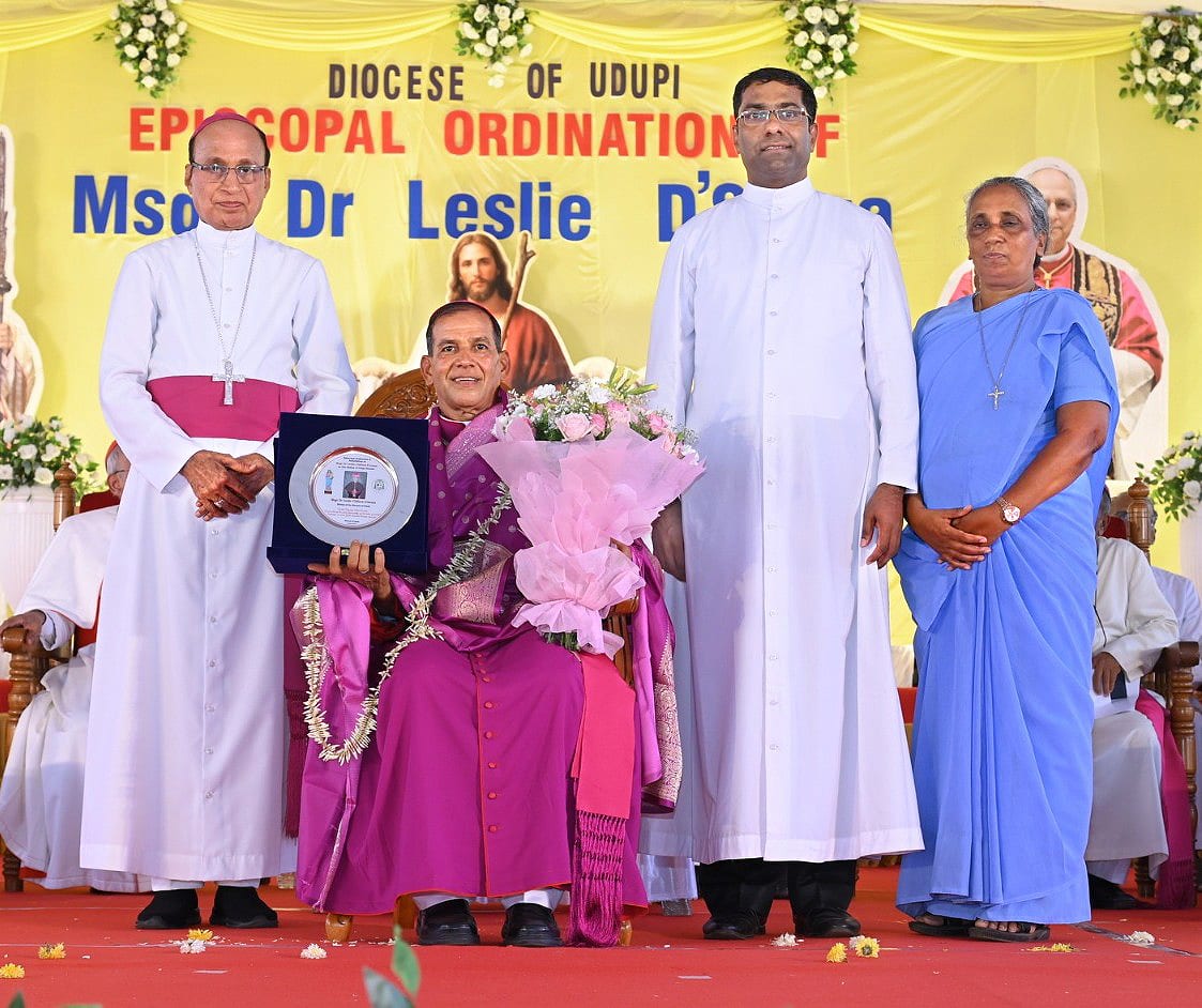 ಇಲ್ಲಿನ ಮಿಲಾಗ್ರಿಸ್ ಕೆಥೆಡ್ರಲ್ ನಲ್ಲಿ ಉಡುಪಿ ಧರ್ಮಪ್ರಾಂತ್ಯದ ನೂತನ ಧರ್ಮಾಧ್ಯಕ್ಷರಾಗಿ ಪೀಠಾರೋಹಣಗೈದ ವಂ. ಡಾ. ಲೆಸ್ಲಿ ಕ್ಲಿಫರ್ಡ್ ಡಿಸೋಜ ಅವರನ್ನು ಭಾವನಾತ್ಮಕ ಸಮಾರಂಭದಲ್ಲಿ ಸಾರ್ವಜನಿಕವಾಗಿ ಅಭಿನಂದಿಸಲಾಯಿತು. ಧರ್ಮಪ್ರಾಂತ್ಯದ ಪರವಾಗಿ ಪ್ರೇಷಿತ ಆಡಳಿತಾಧಿಕಾರಿ ವಂ.ಡಾ.ಜೆರಾಲ್ಡ್ ಐಸಾಕ್ ಲೋಬೊ ನೂತನ ಧರ್ಮಾಧ್ಯಕ್ಷರನ್ನು ಅಭಿನಂದಿಸಿದರು.ಗೋವಾ ಮತ್ತು ದಮನ್ ಮಹಾಧರ್ಮಪ್ರಾಂತ್ಯದ ಮಹಾಧರ್ಮಾಧ್ಯಕ್ಷ ಕಾರ್ಡಿನಲ್ ಫಿಲಿಪ್ ನೆರಿ ಫೆರಾವೊ ತಮ್ಮ ಸಂದೇಶದಲ್ಲಿ ನೂತನ ಧರ್ಮಾಧ್ಯಕ್ಷರು ಅಪೋಸ್ತಲರ ಉತ್ತರಾಧಿಕಾರಿಗಳಾಗಿ ಹೊತ್ತಿರುವ ಜವಾಬ್ದಾರಿಯನ್ನು ವಿವರಿಸಿದರು. ಧರ್ಮಾಧ್ಯಕ್ಷ ಲೆಸ್ಲಿ ಅವರ ಸಮೃದ್ಧ ಶೈಕ್ಷಣಿಕ ಹಿನ್ನೆಲೆ, ಪಾಸ್ಟರಲ್ ಅನುಭವ ಹಾಗೂ ಸರಳ ಜೀವನಶೈಲಿ ಧರ್ಮಪ್ರಾಂತ್ಯವನ್ನು ಆಧ್ಯಾತ್ಮಿಕ ಬೆಳವಣಿಗೆ ಮತ್ತು ಏಕತೆಯ ದಿಕ್ಕಿನಲ್ಲಿ ಮುನ್ನಡೆಸಲಿದೆ ಎಂದು ಹಾರೈಸಿದರು.ತಮ್ಮ ಹೃದಯಸ್ಪರ್ಶಿ ಭಾಷಣದಲ್ಲಿ ನೂತನ ಧರ್ಮಾಧ್ಯಕ್ಷ ಅತೀ ವಂ.ಡಾ.ಲೆಸ್ಲಿ ಡಿಸೋಜ, ತಮ್ಮ ಮುಂದಿರುವ ಸವಾಲುಗಳನ್ನು ವಿನಯದಿಂದ ಒಪ್ಪಿಕೊಂಡು, ನಾನು ನನ್ನ ಶಕ್ತಿಯಿಂದಲ್ಲ, ದೇವರ ಮೇಲಿನ ನಂಬಿಕೆಯಿಂದ ಈ ದೀಕ್ಷೆ ಪಡೆದಿದ್ದೇನೆ, ಎಲ್ಲರೂ ಸೇರಿ ಪ್ರೀತಿ, ಸೇವೆ ಮತ್ತು ಸತ್ಯದ ನೆಲೆಯಲ್ಲಿ ಧರ್ಮಸಭೆಯನ್ನು ಕಟ್ಟೋಣ ಎಂದವರು ಹೇಳಿದರು. ದೇವರಿಗೆ, ತಮ್ಮ ಕುಟುಂಬಕ್ಕೆ, ಗುರುಗಳಿಗೆ ಹಾಗೂ ಭಕ್ತರಿಗೆ ಆಳವಾದ ಕೃತಜ್ಞತೆ ಸಲ್ಲಿಸಿದರು.ನಿವೃತ್ತರಾದ ಧರ್ಮಾಧ್ಯಕ್ಷ ವಂ.ಡಾ. ಜೆರಾಲ್ಡ್ ಐಸಾಕ್ ಲೋಬೊ ಅವರು ಧರ್ಮಪ್ರಾಂತ್ಯಕ್ಕೆ ನೀಡಿದ ಸೇವೆಗೆ ಗೌರವ ಸಲ್ಲಿಸಲಾಯಿತು. ಉಡುಪಿ ಶಾಸಕ ಯಶಪಾಲ ಸುವರ್ಣ, ವಿ.ಪ. ಸದಸ್ಯ ಐವನ್ ಡಿಸೋಜಾ, ಮಾಜಿ ಸಚಿವರಾದ ವಿನಯಕುಮಾರ್ ಸೊರಕೆ, ಅಭಯಚಂದ್ರ ಜೈನ್. ಮಾಜಿ ಶಾಸಕರಾದ ರಘುಪತಿ ಭಟ್, ಜೆ. ಆರ್. ಲೋಬೊ, ಕರಾವಳಿ ಅಭಿವೃದ್ಧಿ ಮಂಡಳಿ ಅಧ್ಯಕ್ಷರಾದ ಎಂ. ಎ. ಗಫೂರ್, ಕ್ರೈಸ್ತ ಅಭಿವೃದ್ಧಿ ನಿಗಮದ ನಿರ್ದೇಶಕ ಪ್ರಶಾಂತ್ ಜತ್ತನ್ನ ಸಹಿತ ಹಲವು ರಾಜಕೀಯ ಮುಖಂಡರು ಇದ್ದರು. ವಂ.ಫರ್ಡಿನಾಂಡ್ ಗೊನ್ಸಾಲ್ವಿಸ್ ಸ್ವಾಗತಿಸಿದರು. ವಂ.ರೋಶನ್ ಡಿಸೋಜಾ ವಂದಿಸಿದರು. ಧಾರ್ಮಿಕ ವಿಧಿ ವಿಧಾನಗಳ ಕಾರ್ಯಕ್ರಮದ ನಿರ್ವಹಣೆಯನ್ನು ವಂ.ವಿಲ್ಸನ್ ಡಿಸೋಜಾ, ಸಭಾ ಕಾರ್ಯಕ್ರಮದ ನಿರ್ವಹಣೆಯನ್ನು ವಂ.ಡೆನಿಸ್ ಡೆಸಾ ನೆರವೇರಿಸಿದರು.ಯಾನ್ ತುಳುವಪ್ಪೆನ ಮಗೆ...ನೂತನ ಧರ್ಮಾಧ್ಯಕ್ಷ ಡಾ. ಲೆಸ್ಲಿ ಡಿಸೋಜ ಅವರು ಕೊಂಕಣಿ, ಇಂಗ್ಲಿಷ್, ಕನ್ನಡ ಮತ್ತು ಸ್ಥಳೀಯ ತುಳು ಭಾಷೆಗಳಲ್ಲಿ ಮಾತನಾಡಿದ್ದು ವಿಶೇಷವಾಗಿತ್ತು.