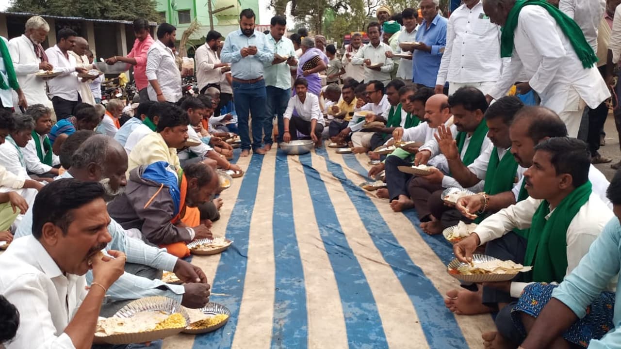 ಈ ವೇಳೆ ಪಟ್ಟಣದ ಹಳ್ಳದಕೇರಿ ಓಣಿಯ ಮಹಿಳೆಯರು ಬುಂದಿ, ರೊಟ್ಟಿ, ಹೆಸರುಕಾಳು ಪಲ್ಯ, ಶೇಂಗಾ ಚಟ್ನಿ, ಮೊಸರು, ಬುತ್ತಿಯ ಊಟದ ವ್ಯವಸ್ಥೆ ಮಾಡುವ ಮೂಲಕ ಹೋರಾಟಗಾರರಿಗೆ ನೈತಿಕ ಬೆಂಬಲ ವ್ಯಕ್ತಪಡಿಸಿದರು. ಈ ವೇಳೆ, ರೈತರು ಹಾಗೂ ಹೋರಾಟಗಾರರು ರಸ್ತೆಯ ಮೇಲೆ ಕುಳಿತು ಊಟ ಮಾಡಿ ಗಮನ ಸೆಳೆದರು.ಬೊಮ್ಮಾಯಿ ಭೇಟಿ: